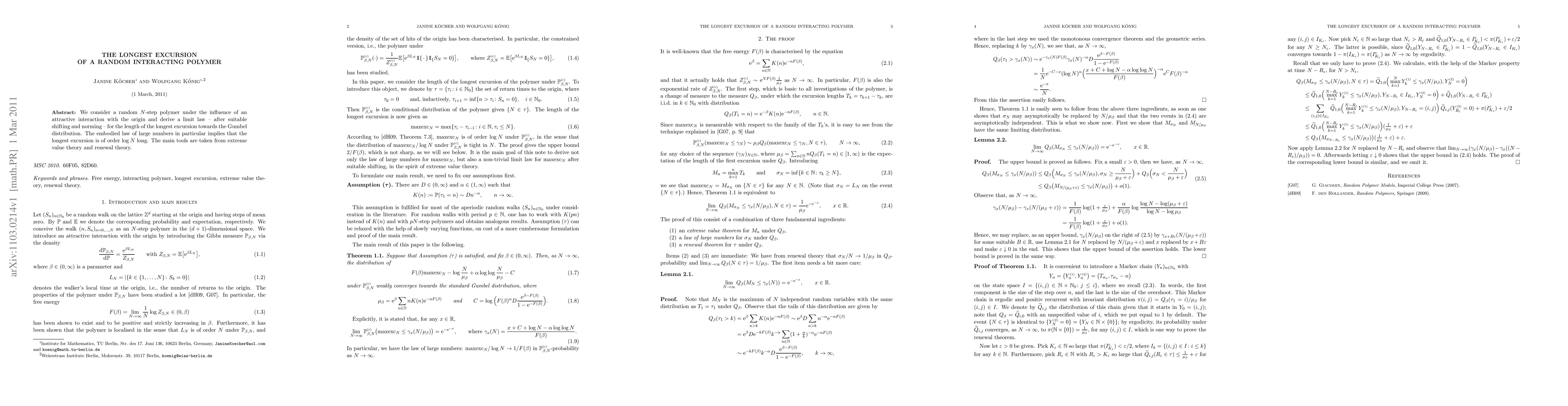 This paper studies the longest excursion of a random $N$-step polymer influenced by an attractive interaction with the origin, deriving a limit law that converges to the Gumbel distribution. The result shows that the longest excursion length scales as $\log N$.