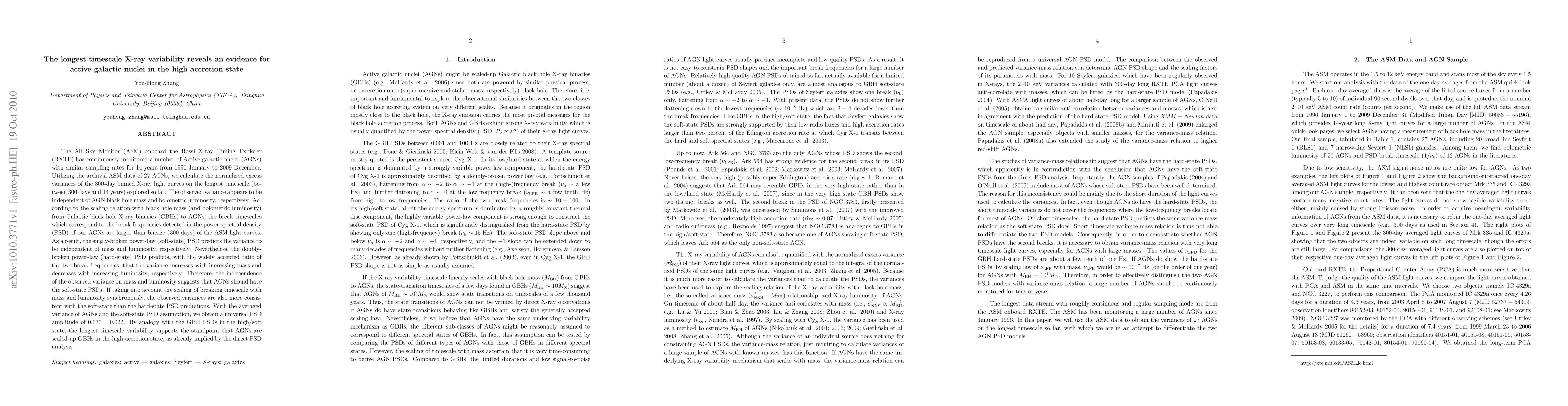 The All Sky Monitor (ASM) onboard the Rossi X-ray Timing Explorer (RXTE) has continuously monitored a number of Active galactic nuclei (AGNs) with similar sampling rates for 14 years from 1996 January to 2009 December. Utilizing the archival ASM data of 27 AGNs, we calculate the normalized excess variances of the 300-day binned X-ray light curves on the longest timescale (between 300 days and 14 years) explored so far. The observed variance appears to be independent of AGN black hole mass and bolometric luminosity, respectively. According to the scaling relation with black hole mass (and bolometric luminosity) from Galactic black hole X-ray binaries (GBHs) to AGNs, the break timescales which correspond to the break frequencies detected in the power spectral density (PSD) of our AGNs are larger than binsize (300 days) of the ASM light curves. As a result, the singly broken power-law (soft-state) PSD predicts the variance to be independent of mass and luminosity, respectively. Nevertheless, the doubly-broken power-law (hard-state) PSD predicts, with the widely accepted ratio of the two break frequencies, that the variance increases with increasing mass and decreases with increasing luminosity, respectively. Therefore, the independence of the observed variance on mass and luminosity suggests that AGNs should have the soft-state PSDs. If taking into account the scaling of breaking timescale with mass and luminosity synchronously, the observed variances are also more consistent with the soft-state than the hard-state PSD predictions. With the averaged variance of AGNs and the soft-state PSD assumption, we obtain a universal PSD amplitude of $0.030\pm0.022$. By analogy with the GBH PSDs in the high/soft state, the longest timescale variability supports the standpoint that AGNs are scaled-up GBHs in the high accretion state, as already implied by the direct PSD analysis.