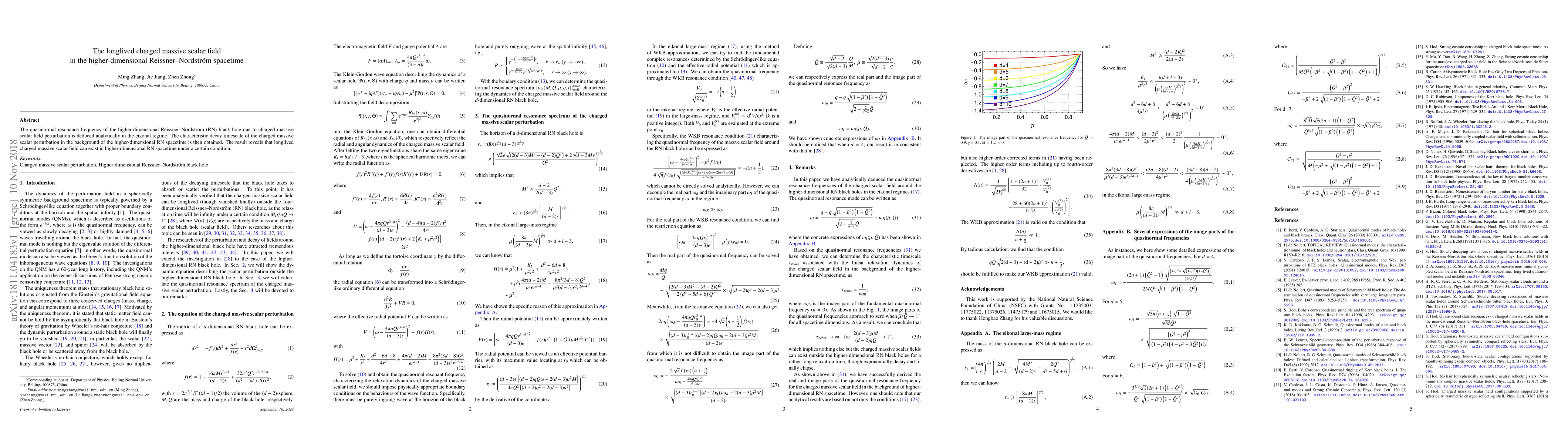 This paper analytically deduces the quasinormal resonance frequency of a higher-dimensional Reissner-Nordström black hole perturbed by a charged massive scalar field in the eikonal regime, revealing the potential for longlived charged massive scalar fields to exist under specific conditions.