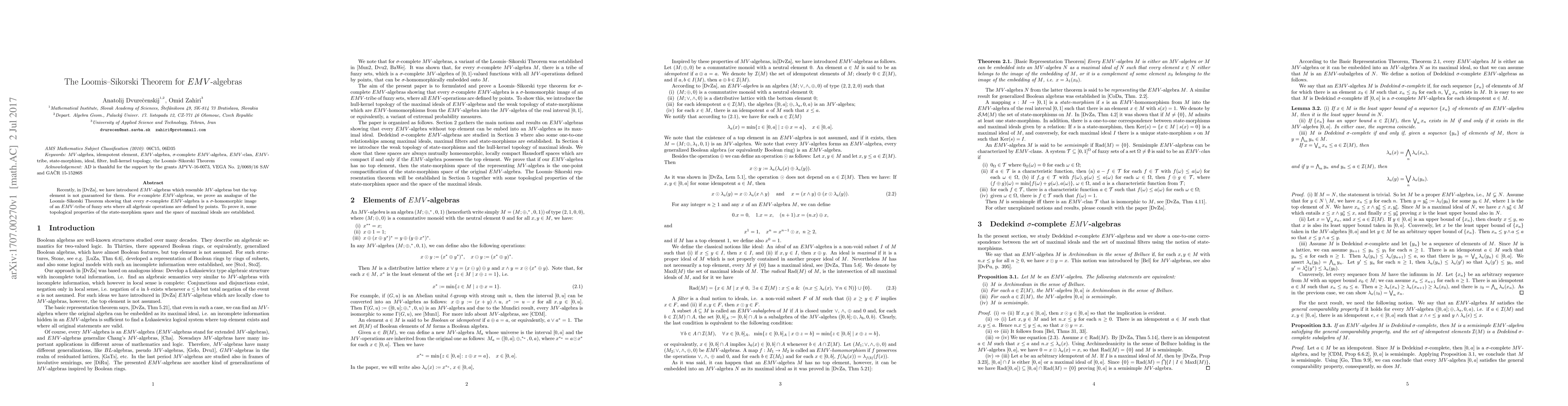 Summary: This paper introduces $EMV$-algebras, which lack a top element unlike $MV$-algebras, and proves an analogue of the Loomis--Sikorski Theorem for $\sigma$-complete $EMV$-algebras, demonstrating they are $\sigma$-homomorphic images of $EMV$-tribes of fuzzy sets. The proof utilizes topological properties of state-morphism and maximal ideal spaces.
