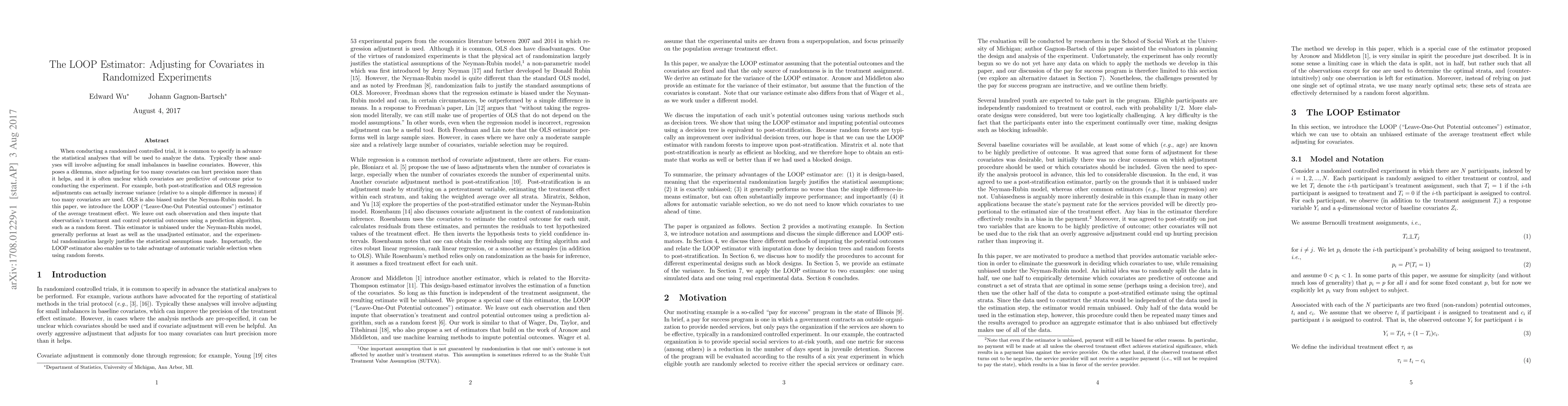 When conducting a randomized controlled trial, it is common to specify in advance the statistical analyses that will be used to analyze the data. Typically these analyses will involve adjusting for small imbalances in baseline covariates. However, this poses a dilemma, since adjusting for too many covariates can hurt precision more than it helps, and it is often unclear which covariates are predictive of outcome prior to conducting the experiment. For example, both post-stratification and OLS regression adjustments can actually increase variance (relative to a simple difference in means) if too many covariates are used. OLS is also biased under the Neyman-Rubin model. In this paper, we introduce the LOOP ("Leave-One-Out Potential outcomes") estimator of the average treatment effect. We leave out each observation and then impute that observation's treatment and control potential outcomes using a prediction algorithm, such as a random forest. This estimator is unbiased under the Neyman-Rubin model, generally performs at least as well as the unadjusted estimator, and the experimental randomization largely justifies the statistical assumptions made. Importantly, the LOOP estimator also enables us to take advantage of automatic variable selection when using random forests.