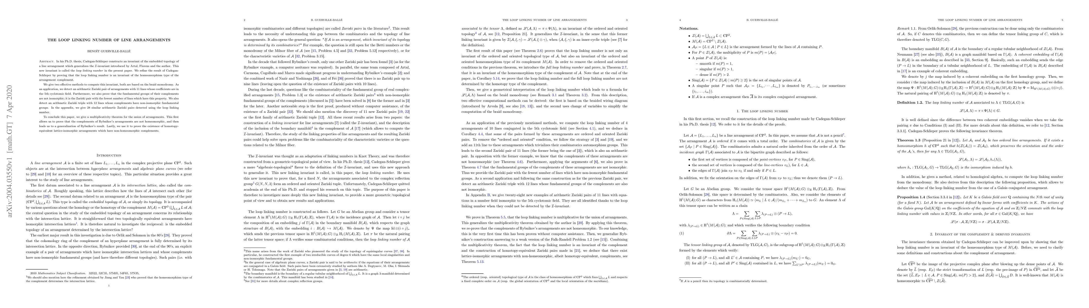 In his Ph.D. thesis, Cadegan-Schlieper constructs an invariant of the embedded topology of a line arrangement which generalizes the $\mathcal{I}$-invariant introduced by Artal, Florens and the author. This new invariant is called the loop linking number in the present paper. We refine the result of Cadegan-Schlieper by proving that the loop linking number is an invariant of the homeomorphism type of the arrangement complement. We give two effective methods to compute this invariant, both are based on the braid monodromy. As an application, we detect an arithmetic Zariski pair of arrangements with 11 lines whose coefficients are in the 5th cyclotomic field. Furthermore, we also prove that the fundamental groups of their complements are not isomorphic; it is the Zariski pair with the fewest number of lines which have this property. We also detect an arithmetic Zariski triple with 12 lines whose complements have non-isomorphic fundamental groups. In the appendix, we give 28 similar arithmetic Zariski pairs detected using the loop linking number. To conclude this paper, we give a multiplicativity theorem for the union of arrangements. This first allows us to prove that the complements of Rybnikov's arrangements are not homeomorphic, and then leads us to a generalization of Rybnikov's result. Lastly, we use it to prove the existence of homotopy-equivalent lattice-isomorphic arrangements which have non-homeomorphic complements.