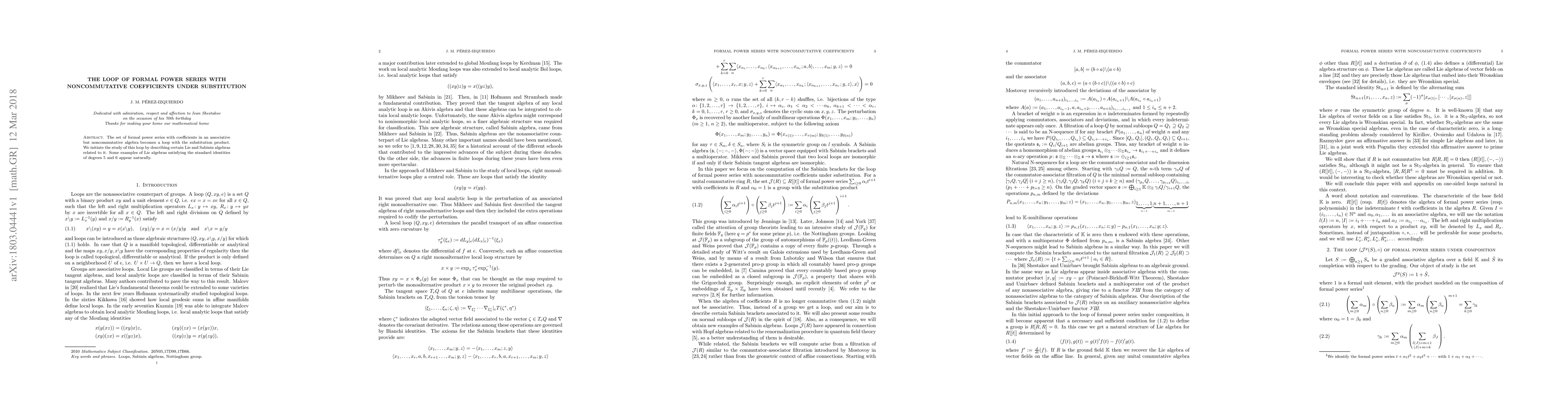 Summary: This paper investigates the algebraic structure formed by formal power series with noncommutative coefficients under substitution, introducing the concept of a loop. It explores related Lie and Sabinin algebras and provides examples of Lie algebras satisfying specific degree identities.