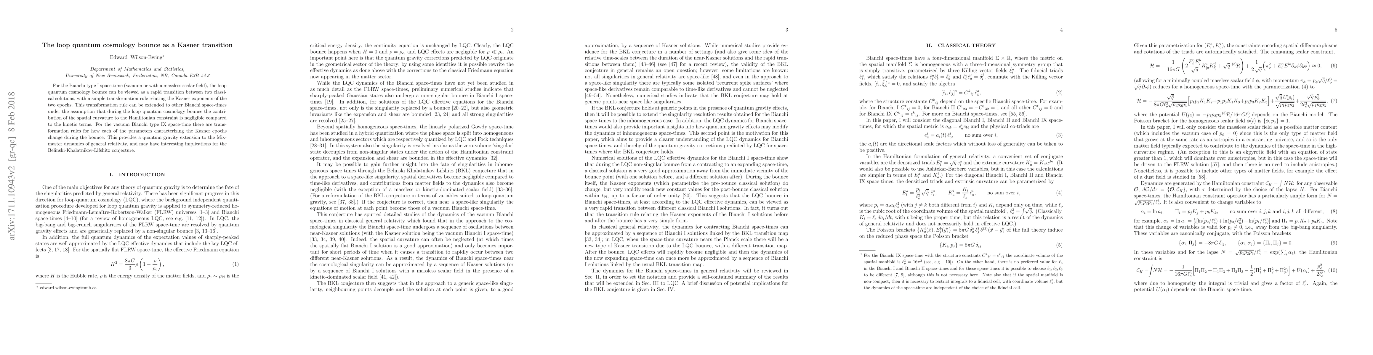 This paper explores the loop quantum cosmology bounce in Bianchi type I space-time, showing it as a transition between two classical solutions via Kasner exponents. The study extends these findings to other Bianchi space-times, suggesting implications for the Belinski-Khalatnikov-Lifshitz conjecture.
