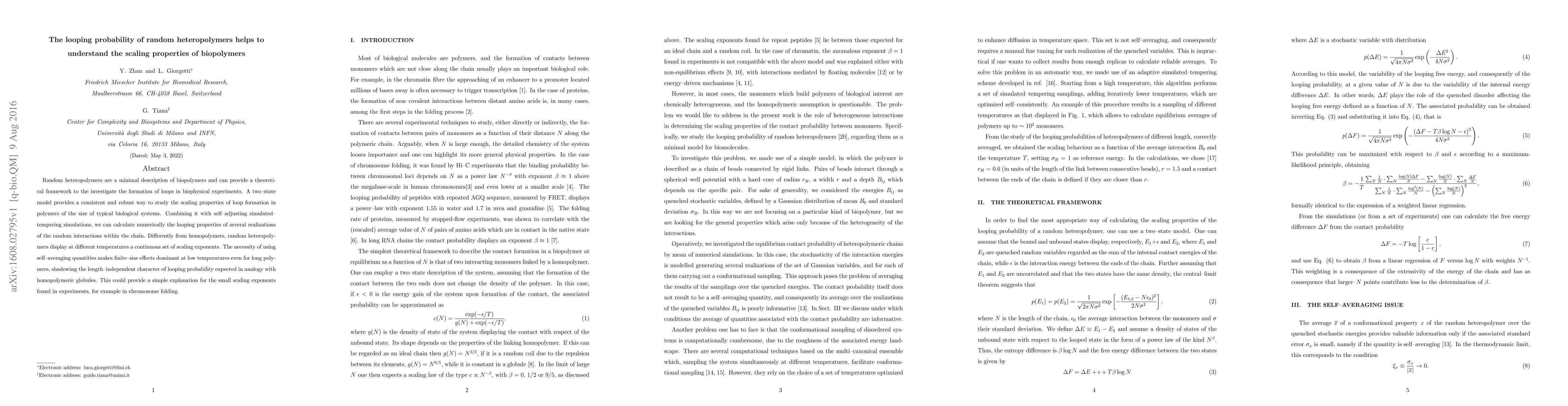 Random heteropolymers are a minimal description of biopolymers and can provide a theoretical framework to the investigate the formation of loops in biophysical experiments. A two--state model provides a consistent and robust way to study the scaling properties of loop formation in polymers of the size of typical biological systems. Combining it with self--adjusting simulated--tempering simulations, we can calculate numerically the looping properties of several realizations of the random interactions within the chain. Differently from homopolymers, random heteropolymers display at different temperatures a continuous set of scaling exponents. The necessity of using self--averaging quantities makes finite--size effects dominant at low temperatures even for long polymers, shadowing the length--independent character of looping probability expected in analogy with homopolymeric globules. This could provide a simple explanation for the small scaling exponents found in experiments, for example in chromosome folding.