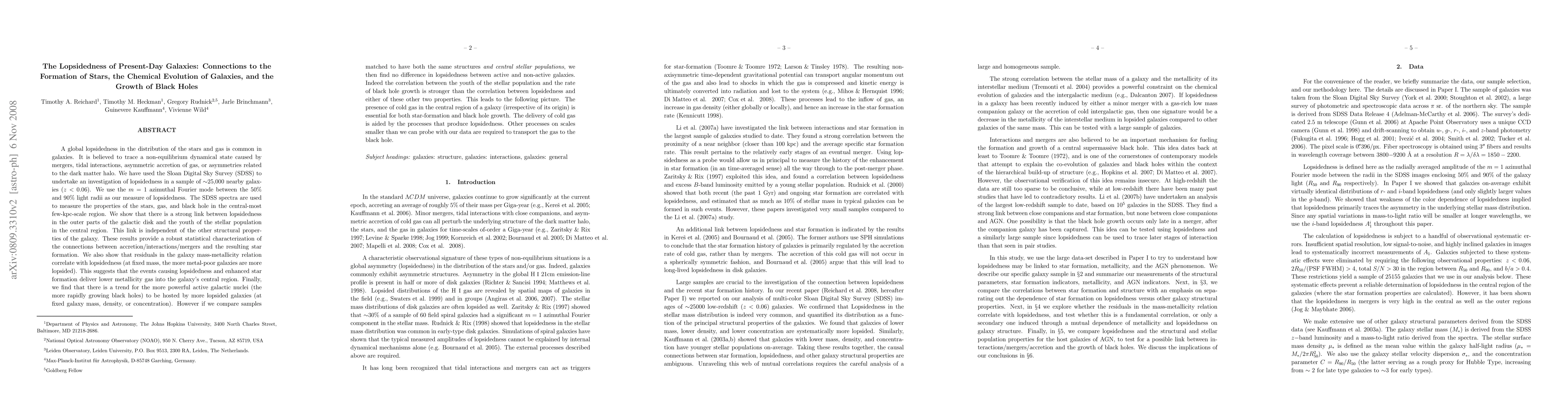 We have used the Sloan Digital Sky Survey (SDSS) to undertake an investigation of lopsidedness in a sample of ~25,000 nearby galaxies (z < 0.06). We use the m=1 azimuthal Fourier mode between the 50% and 90% light radii as our measure of lopsidedness. The SDSS spectra are used to measure the properties of the stars, gas, and black hole in the central-most few-kpc-scale region. We show that there is a strong link between lopsidedness in the outer parts of the galactic disk and the youth of the stellar population in the central region. This link is independent of the other structural properties of the galaxy. These results provide a robust statistical characterization of the connections between accretion/interactions/mergers and the resulting star formation. We also show that residuals in the galaxy mass-metallicity relation correlate with lopsidedness (at fixed mass, the more metal-poor galaxies are more lopsided). This suggests that the events causing lopsidedness and enhanced star formation deliver lower metallicity gas into the galaxy's central region. Finally, we find that there is a trend for the more powerful active galactic nuclei to be hosted by more lopsided galaxies (at fixed galaxy mass, density, or concentration). However if we compare samples matched to have both the same structures and central stellar populations, we then find no difference in lopsidedness between active and non-active galaxies. This leads to the following picture. The presence of cold gas in the central region of a galaxy (irrespective of its origin) is essential for both star-formation and black hole growth. The delivery of cold gas is aided by the processes that produce lopsidedness. Other processes on scales smaller than we can probe with our data are required to transport the gas to the black hole.