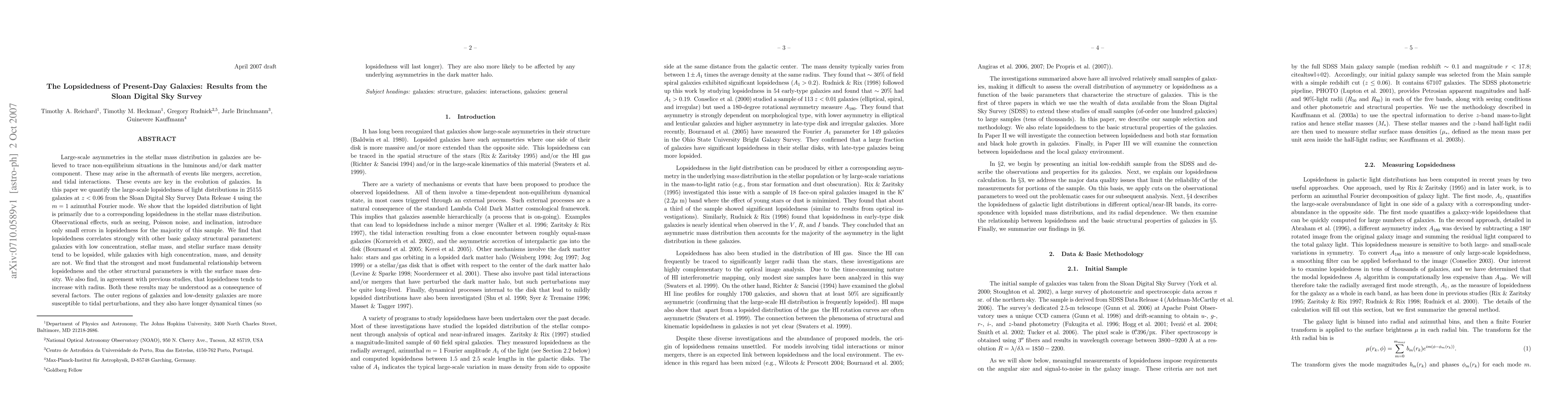 Large-scale asymmetries in the stellar mass distribution in galaxies are believed to trace non-equilibrium situations in the luminous and/or dark matter component. These may arise in the aftermath of events like mergers, accretion, and tidal interactions. These events are key in the evolution of galaxies. In this paper we quantify the large-scale lopsidedness of light distributions in 25155 galaxies at z < 0.06 from the Sloan Digital Sky Survey Data Release 4 using the m = 1 azimuthal Fourier mode. We show that the lopsided distribution of light is primarily due to a corresponding lopsidedness in the stellar mass distribution. Observational effects, such as seeing, Poisson noise, and inclination, introduce only small errors in lopsidedness for the majority of this sample. We find that lopsidedness correlates strongly with other basic galaxy structural parameters: galaxies with low concentration, stellar mass, and stellar surface mass density tend to be lopsided, while galaxies with high concentration, mass, and density are not. We find that the strongest and most fundamental relationship between lopsidedness and the other structural parameters is with the surface mass density. We also find, in agreement with previous studies, that lopsidedness tends to increase with radius. Both these results may be understood as a consequence of several factors. The outer regions of galaxies and low-density galaxies are more susceptible to tidal perturbations, and they also have longer dynamical times (so lopsidedness will last longer). They are also more likely to be affected by any underlying asymmetries in the dark matter halo.