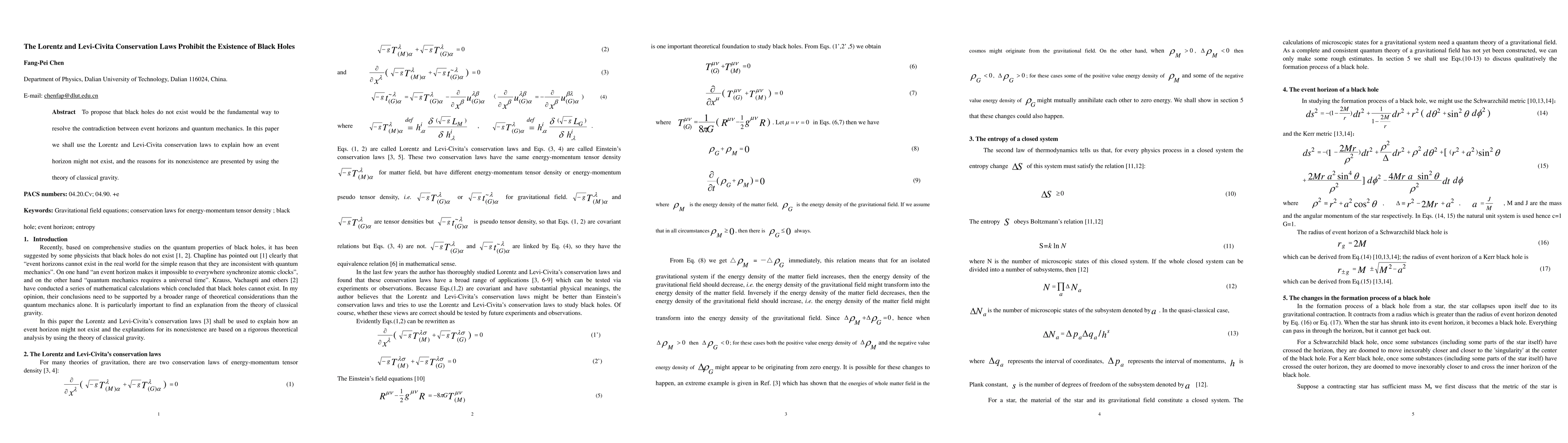 This paper argues that black holes cannot exist due to contradictions between event horizons and quantum mechanics, suggesting that the Lorentz and Levi-Civita conservation laws support the absence of event horizons through classical gravity theory.