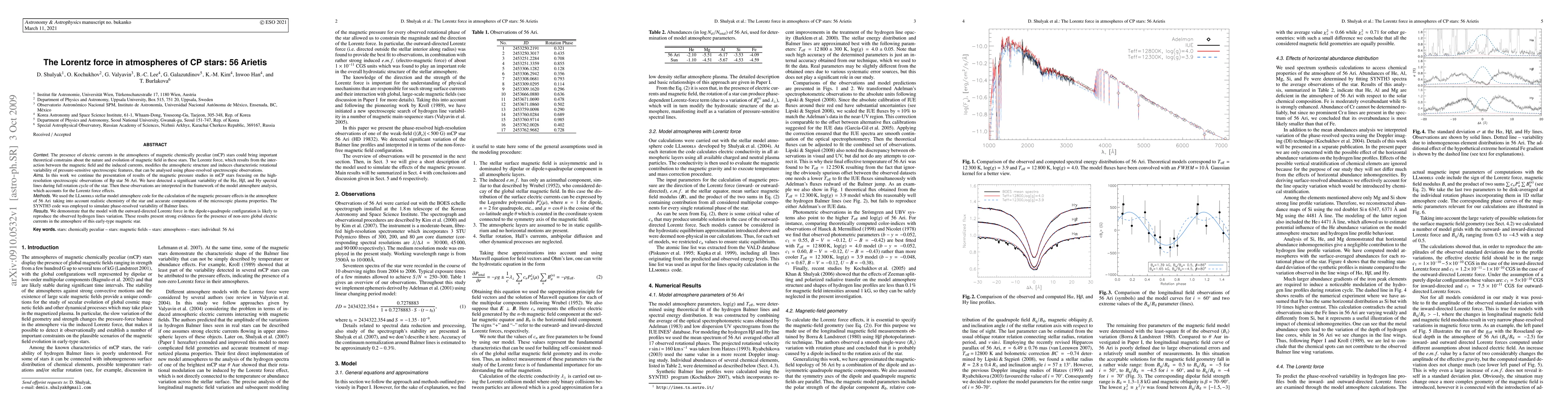 The presence of electric currents in the atmospheres of magnetic chemically peculiar (mCP) stars could bring important theoretical constrains about the nature and evolution of magnetic field in these stars. The Lorentz force, which results from the interaction between the magnetic field and the induced currents, modifies the atmospheric structure and induces characteristic rotational variability of pressure-sensitive spectroscopic features, that can be analysed using phase-resolved spectroscopic observations. In this work we continue the presentation of results of the magnetic pressure studies in mCP stars focusing on the high-resolution spectroscopic observations of Bp star 56Ari. We have detected a significant variability of the Halpha, Hbeta, and Hgamma spectral lines during full rotation cycle of the star. Then these observations are interpreted in the framework of the model atmosphere analysis, which accounts for the Lorentz force effects. We used the LLmodels stellar model atmosphere code for the calculation of the magnetic pressure effects in the atmosphere of 56Ari taking into account realistic chemistry of the star and accurate computations of the microscopic plasma properties. The Synth3 code was employed to simulate phase-resolved variability of Balmer lines. We demonstrate that the model with the outward-directed Lorentz force in the dipole+quadrupole configuration is likely to reproduce the observed hydrogen lines variation. These results present strong evidences for the presence of non-zero global electric currents in the atmosphere of this early-type magnetic star.