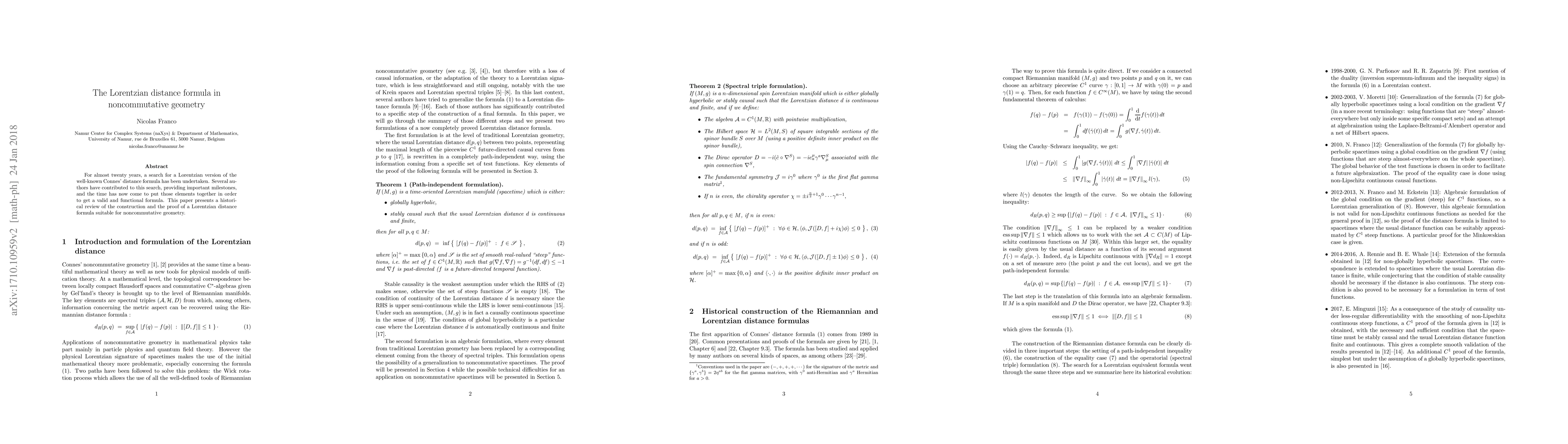 This paper reviews the development and proof of a Lorentzian distance formula tailored for noncommutative geometry, consolidating previous efforts into a coherent and functional result. It marks the culmination of nearly two decades of research in this area.
