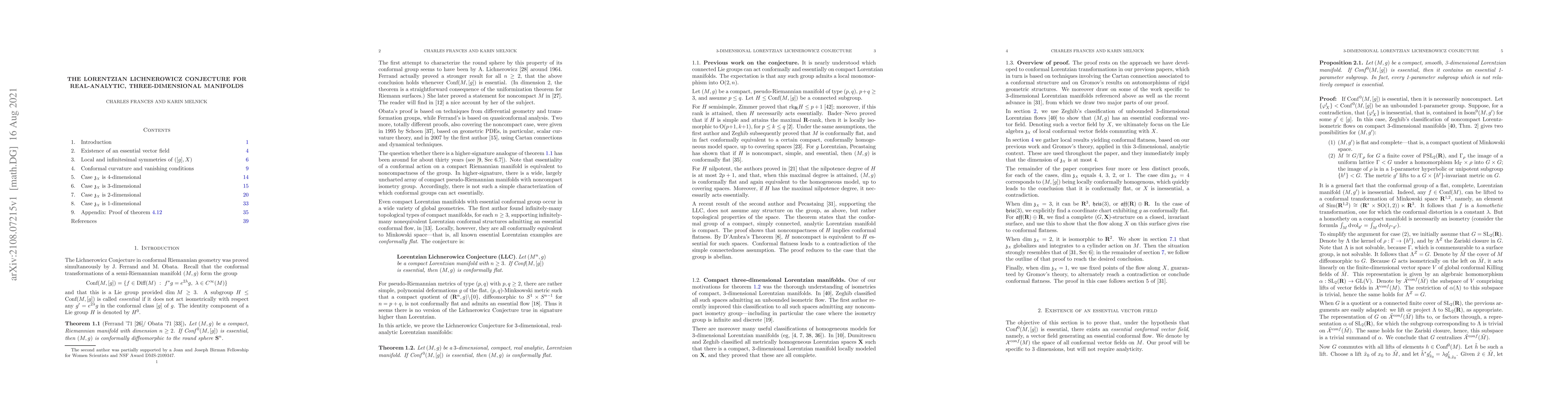Given a compact, three-dimensional, real-analytic Lorentzian manifold $(M,g)$, we prove that the identity component of the conformal group preserves a metric in the conformal class $[g]$, or $(M,g)$ is conformally flat.