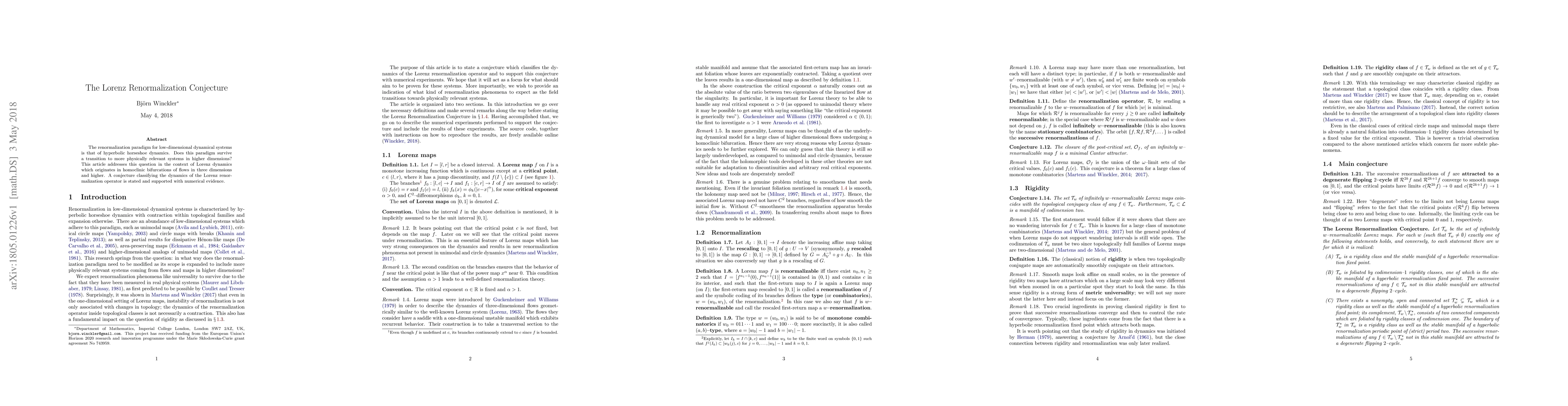 The Lorenz Renormalization Conjecture explores whether hyperbolic horseshoe dynamics, a key feature of renormalization in low-dimensional systems, persists in higher-dimensional Lorenz dynamics arising from homoclinic bifurcations. The paper proposes a conjecture on the Lorenz renormalization operator and provides numerical evidence to support it.