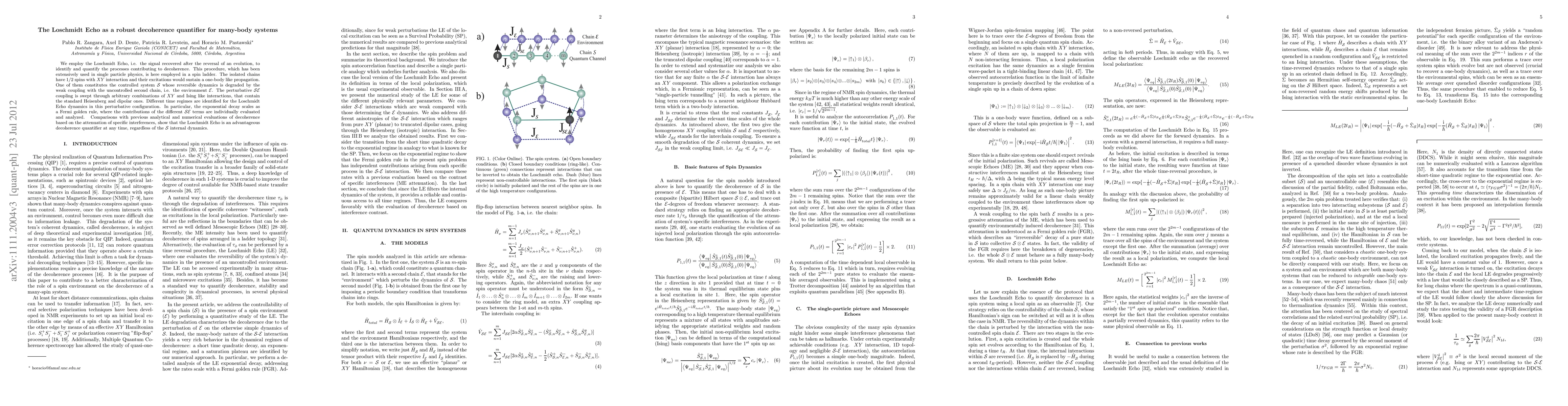 We employ the Loschmidt Echo, i.e. the signal recovered after the reversal of an evolution, to identify and quantify the processes contributing to decoherence. This procedure, which has been extensively used in single particle physics, is here employed in a spin ladder. The isolated chains have 1/2 spins with XY interaction and their excitations would sustain a one-body like propagation. One of them constitutes the controlled system S whose reversible dynamics is degraded by the weak coupling with the uncontrolled second chain, i.e. the environment E. The perturbative SE coupling is swept through arbitrary combinations of XY and Ising like interactions, that contain the standard Heisenberg and dipolar ones. Different time regimes are identified for the Loschmidt Echo dynamics in this perturbative configuration. In particular, the exponential decay scales as a Fermi golden rule, where the contributions of the different SE terms are individually evaluated and analyzed. Comparisons with previous analytical and numerical evaluations of decoherence based on the attenuation of specific interferences, show that the Loschmidt Echo is an advantageous decoherence quantifier at any time, regardless of the S internal dynamics.