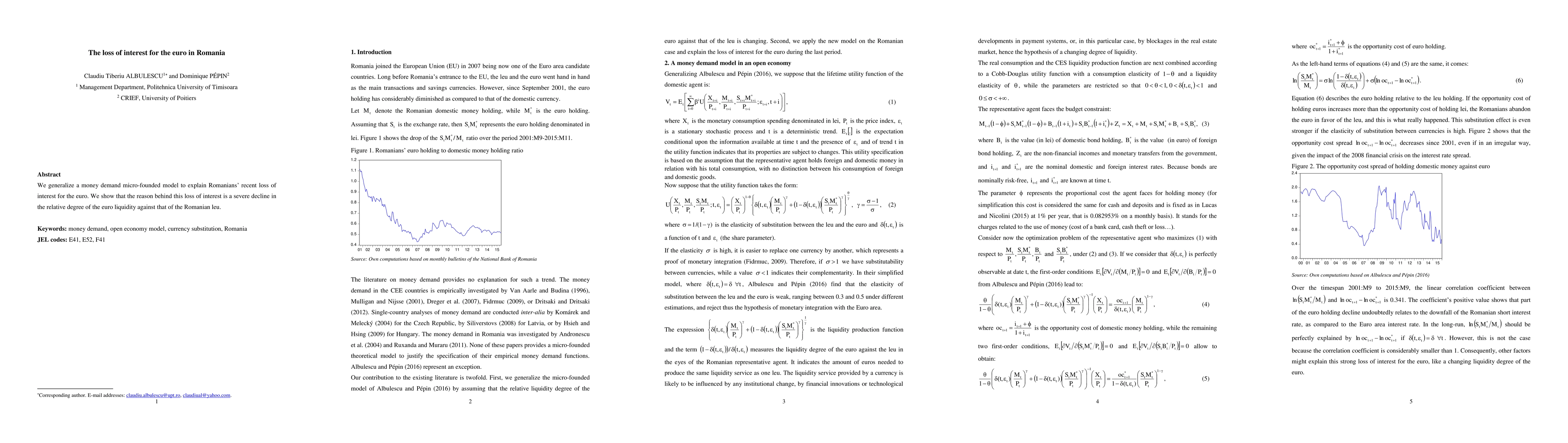 Summary: This paper uses a micro-founded money demand model to analyze Romania's declining interest in the euro, attributing it to a significant drop in euro liquidity relative to the Romanian leu. The study highlights the impact of currency liquidity on national monetary preferences.