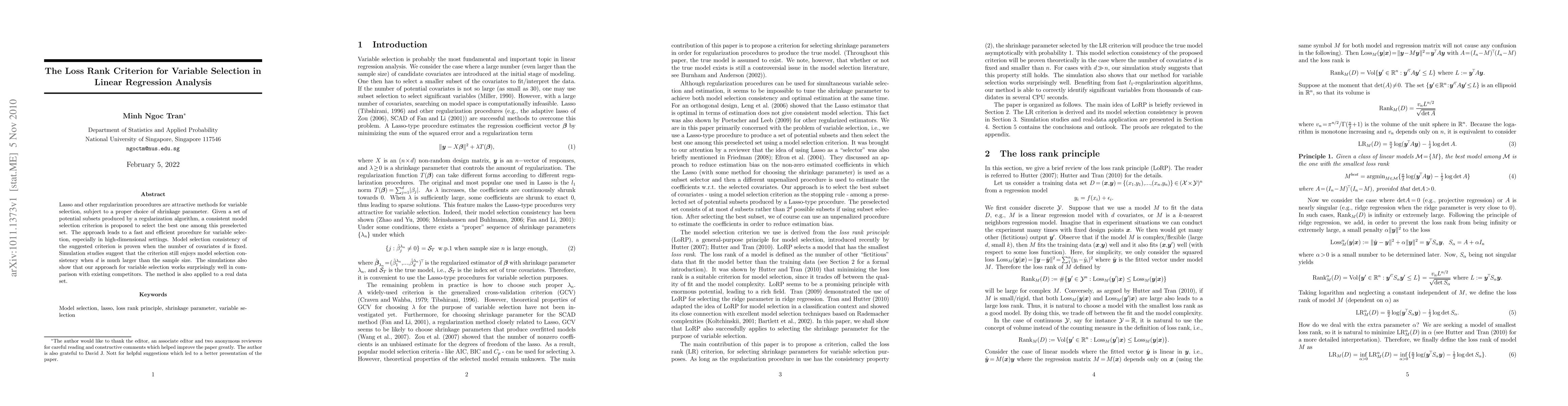 This paper proposes a loss rank criterion for selecting the best subset among those produced by regularization methods like Lasso in linear regression. The criterion is shown to be model selection consistent, especially effective in high-dimensional settings, and performs well in simulations even when the number of covariates exceeds the sample size.