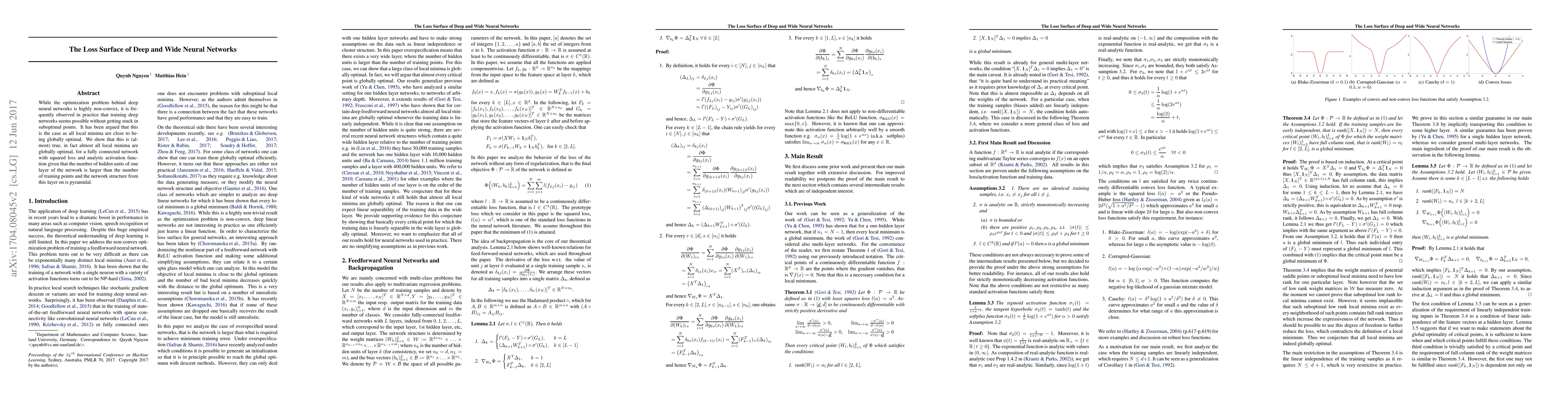 While the optimization problem behind deep neural networks is highly non-convex, it is frequently observed in practice that training deep networks seems possible without getting stuck in suboptimal points. It has been argued that this is the case as all local minima are close to being globally optimal. We show that this is (almost) true, in fact almost all local minima are globally optimal, for a fully connected network with squared loss and analytic activation function given that the number of hidden units of one layer of the network is larger than the number of training points and the network structure from this layer on is pyramidal.