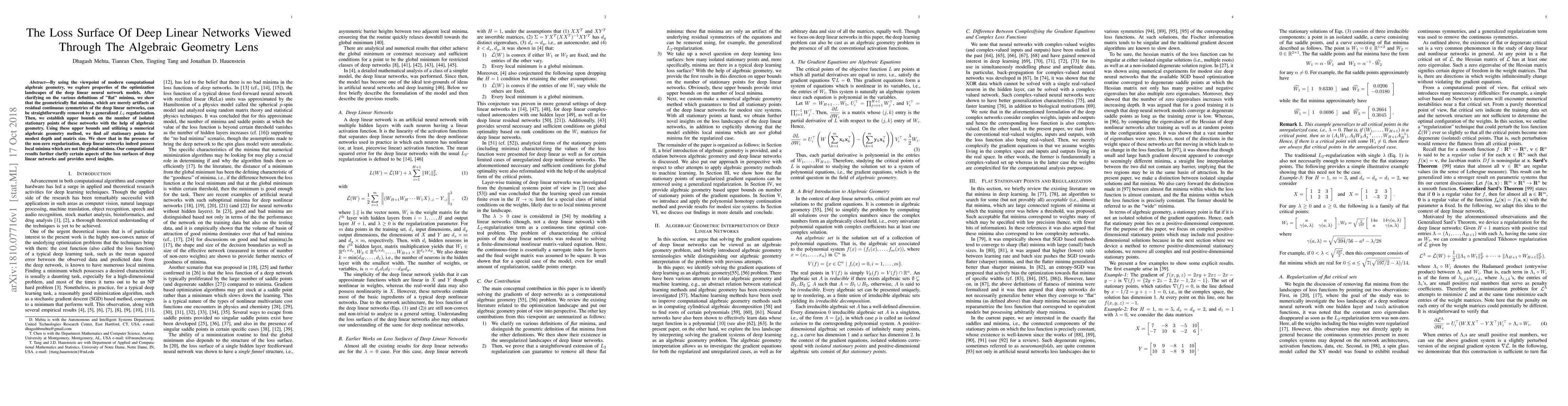 This paper examines deep linear neural networks' optimization landscapes via algebraic geometry, identifying flat minima as symmetry artifacts removable by $L_2$ regularization. It establishes bounds on stationary points, locates them numerically, and reveals the existence of local minima not being global in depth, offering insights into loss surfaces.