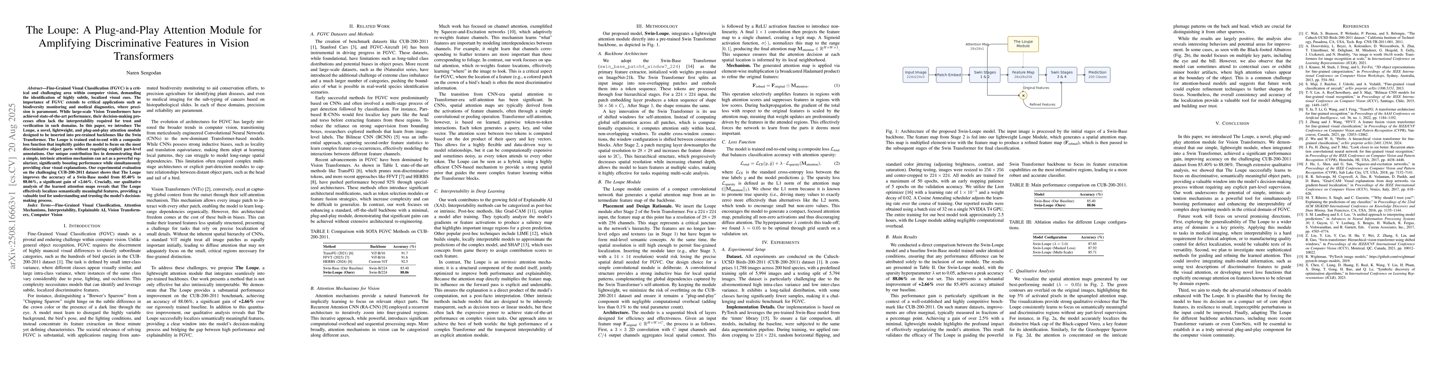 Fine-Grained Visual Classification (FGVC) is a critical and challenging area within computer vision, demanding the identification of highly subtle, localized visual cues. The importance of FGVC extends to critical applications such as biodiversity monitoring and medical diagnostics, where precision is paramount. While large-scale Vision Transformers have achieved state-of-the-art performance, their decision-making processes often lack the interpretability required for trust and verification in such domains. In this paper, we introduce The Loupe, a novel, lightweight, and plug-and-play attention module designed to be inserted into pre-trained backbones like the Swin Transformer. The Loupe is trained end-to-end with a composite loss function that implicitly guides the model to focus on the most discriminative object parts without requiring explicit part-level annotations. Our unique contribution lies in demonstrating that a simple, intrinsic attention mechanism can act as a powerful regularizer, significantly boosting performance while simultaneously providing clear visual explanations. Our experimental evaluation on the challenging CUB-200-2011 dataset shows that The Loupe improves the accuracy of a Swin-Base model from 85.40% to 88.06%, a significant gain of 2.66%. Crucially, our qualitative analysis of the learned attention maps reveals that The Loupe effectively localizes semantically meaningful features, providing a valuable tool for understanding and trusting the model's decision-making process.