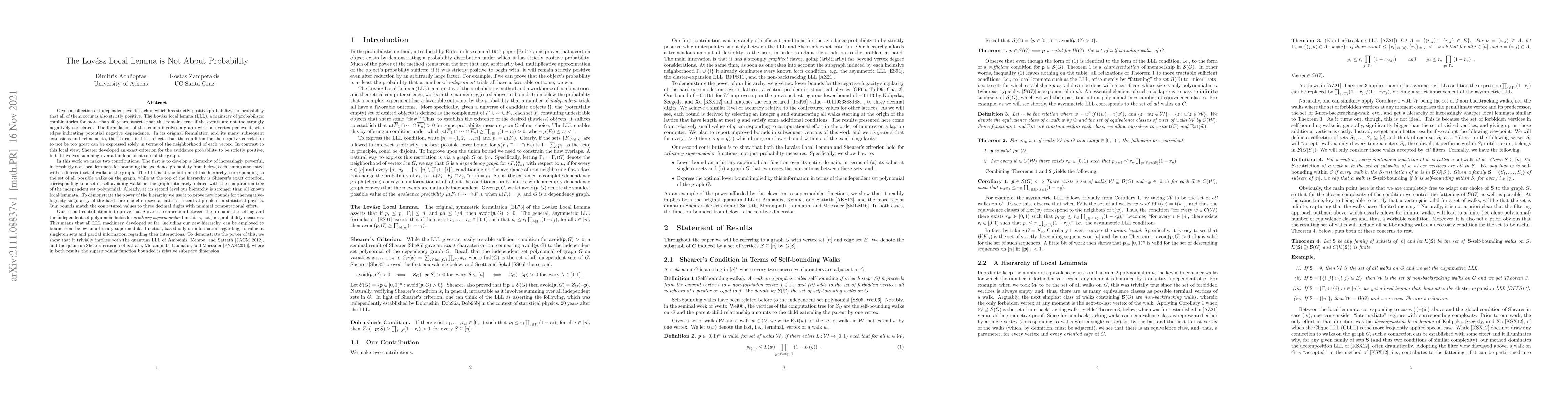 Given a collection of independent events each of which has strictly positive probability, the probability that all of them occur is also strictly positive. The Lov\'asz local lemma (LLL) asserts that this remains true if the events are not too strongly negatively correlated. The formulation of the lemma involves a graph with one vertex per event, with edges indicating potential negative dependence. The word "Local" in LLL reflects that the condition for the negative correlation can be expressed solely in terms of the neighborhood of each vertex. In contrast to this local view, Shearer developed an exact criterion for the avoidance probability to be strictly positive, but it involves summing over all independent sets of the graph. In this work we make two contributions. The first is to develop a hierarchy of increasingly powerful, increasingly non-local lemmata for bounding the avoidance probability from below, each lemma associated with a different set of walks in the graph. Already, at its second level, our hierarchy is stronger than all known local lemmata. To demonstrate its power we prove new bounds for the negative-fugacity singularity of the hard-core model on several lattices, a central problem in statistical physics. Our second contribution is to prove that Shearer's connection between the probabilistic setting and the independent set polynomial holds for \emph{arbitrary supermodular} functions, not just probability measures. This means that all LLL machinery can be employed to bound from below an arbitrary supermodular function, based only on information regarding its value at singleton sets and partial information regarding their interactions. We show that this readily implies both the quantum LLL of Ambainis, Kempe, and Sattath~[JACM 2012], and the quantum Shearer criterion of Sattath, Morampudi, Laumann, and Moessner~[PNAS 2016].