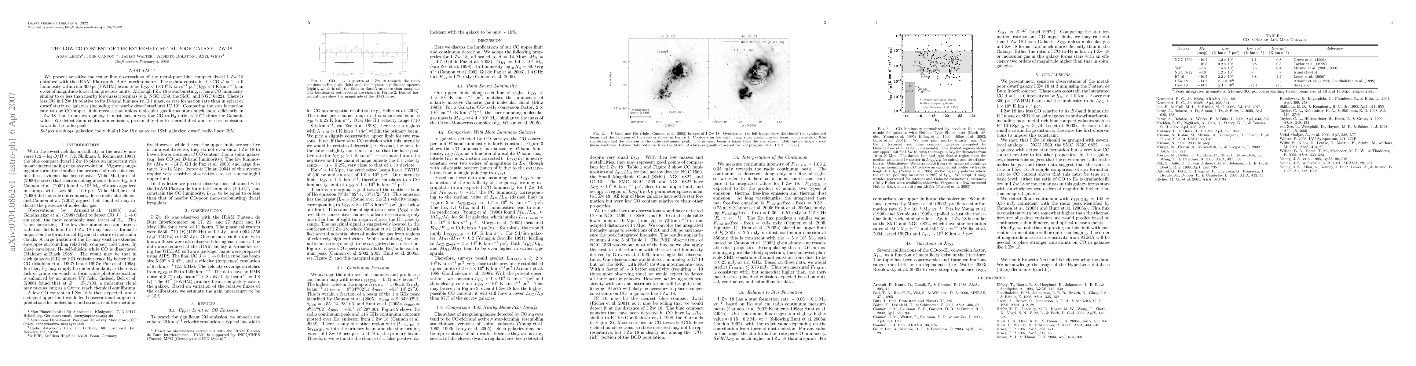 This study reveals that I Zw 18, an extremely metal-poor blue compact dwarf galaxy, exhibits a very low CO content, with an order of magnitude lower CO luminosity than previous estimates. The galaxy's CO-to-H_2 ratio is significantly lower than typical spiral or dwarf starburst galaxies, suggesting an efficient star formation process from its molecular gas.