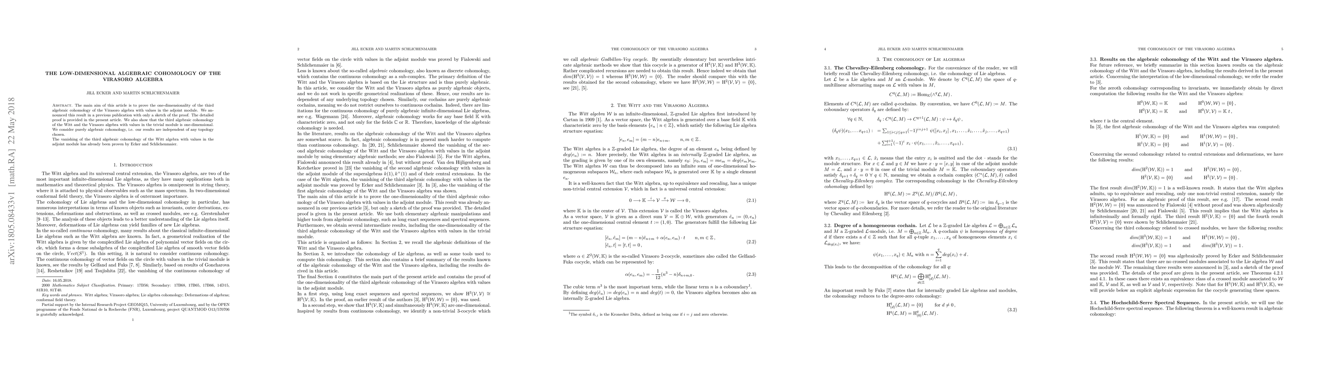 The paper's primary technical contribution is the detailed proof of the one-dimensionality of the third algebraic cohomology of the Virasoro algebra with values in the adjoint module, alongside the extension of this result to the Witt algebra with trivial modules.