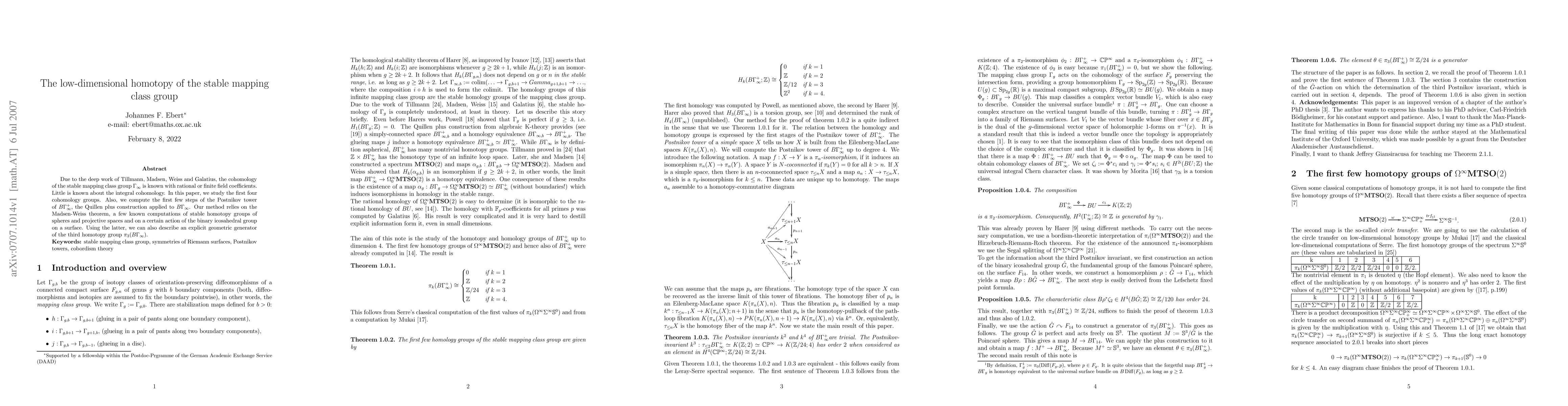 Due to the deep work of Tillmann, Madsen, Weiss and Galatius, the cohomology of the stable mapping class group $\gaminf$ is known with rational or finite field coefficients. Little is known about the integral cohomology. In this paper, we study the first four cohomology groups. Also, we compute the first few steps of the Postnikov tower of $B \gaminf^+$, the Quillen plus construction applied to $B \gaminf$. Our method relies on the Madsen-Weiss theorem, a few known computations of stable homotopy groups of spheres and projective spaces and on a certain action of the binary icosahedral group on a surface. Using the latter, we can also describe an explicit geometric generator of the third homotopy group $\pi_3 (B \gaminf)$.