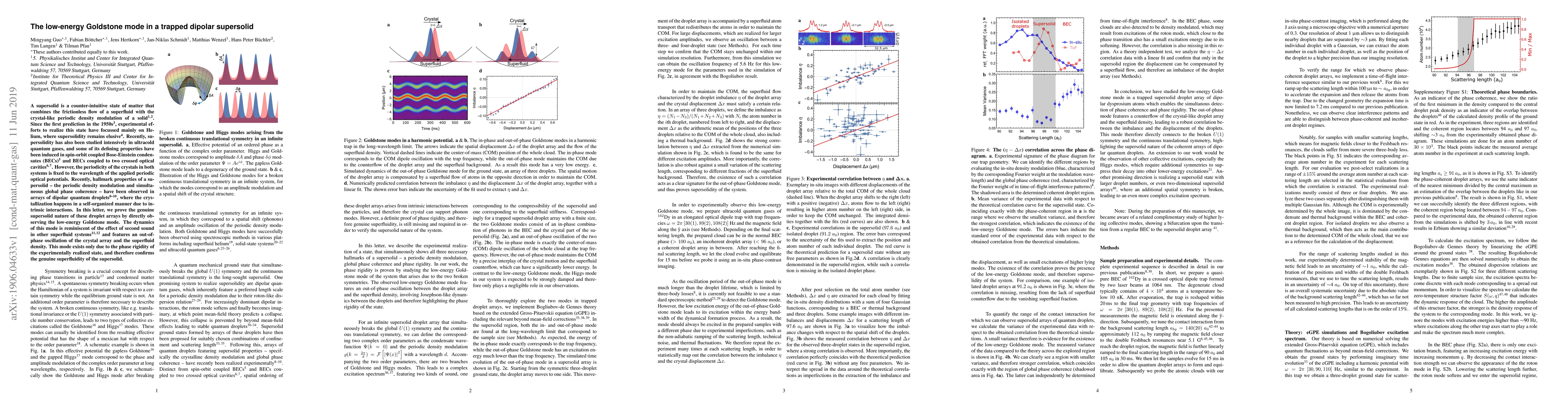 This paper demonstrates the genuine supersolid nature in arrays of dipolar quantum droplets by observing the low-energy Goldstone mode, which exhibits out-of-phase oscillations between the crystal lattice and superfluid density, confirming the phase rigidity and superfluidity of the supersolid state.