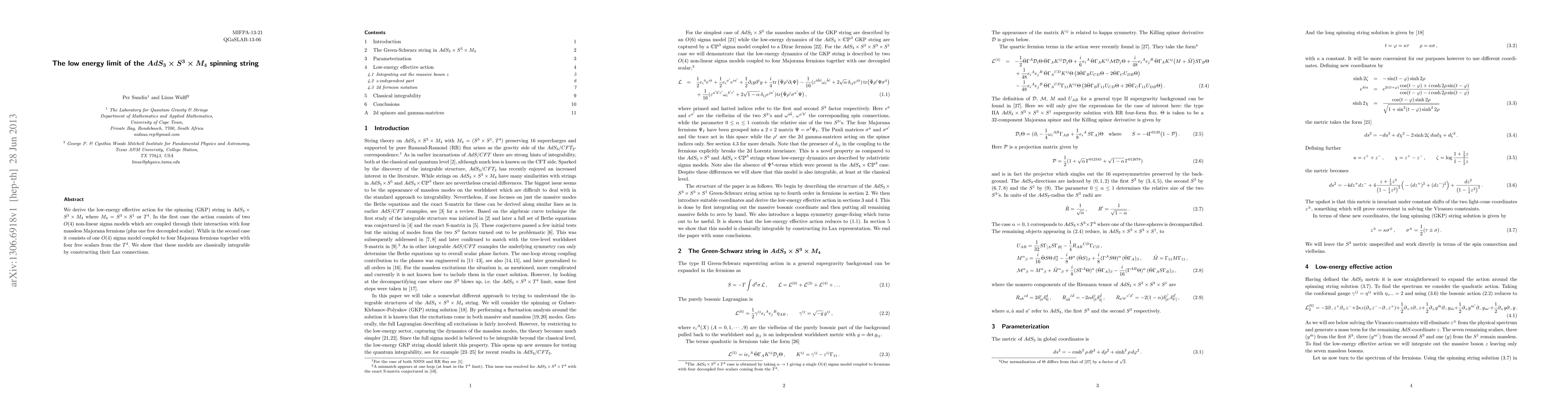 We derive the low-energy effective action for the spinning (GKP) string in AdS(3) x S(3) x M(4) where M(4) = S(3) x S(1) or T(4). In the first case the action consists of two O(4) non-linear sigma models which are coupled through their interaction with four massless Majorana fermions (plus one free decoupled scalar). While in the second case it consists of one O(4) sigma model coupled to four Majorana fermions together with four free scalars from the T(4). We show that these models are classically integrable by constructing their Lax connections.