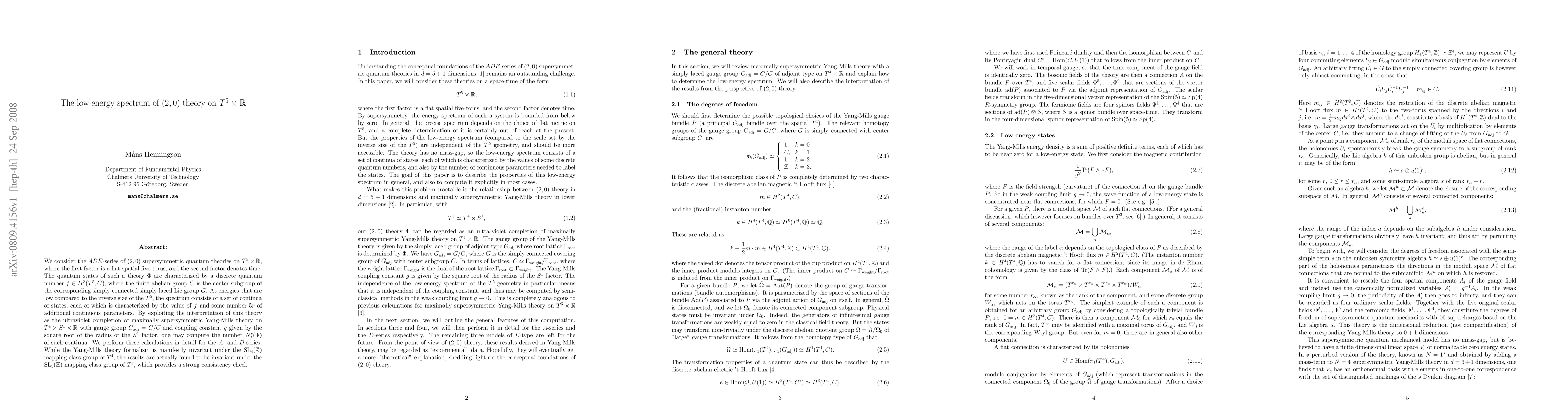 We consider the ADE-series of (2, 0) supersymmetric quantum theories on T^5 \times R, where the first factor is a flat spatial five-torus, and the second factor denotes time. The quantum states of such a theory \Phi are characterized by a discrete quantum number f \in H^3 (T^5, C), where the finite abelian group C is the center subgroup of the corresponding simply connected simply laced Lie group G. At energies that are low compared to the inverse size of the T^5, the spectrum consists of a set of continua of states, each of which is characterized by the value of f and some number 5r of additional continuous parameters. By exploiting the interpretation of this theory as the ultraviolet completion of maximally supersymmetric Yang-Mills theory on T^4 \times S^1 \times R with gauge group G_{adj} = G/C and coupling constant g given by the square root of the radius of the S^1 factor, one may compute the number N_f^r (\Phi) of such continua. We perform these calculations in detail for the A- and D-series. While the Yang-Mills theory formalism is manifestly invariant under the \SL_4 (Z) mapping class group of T^4, the results are actually found to be invariant under the \SL_5 (Z) mapping class group of T^5, which provides a strong consistency check.