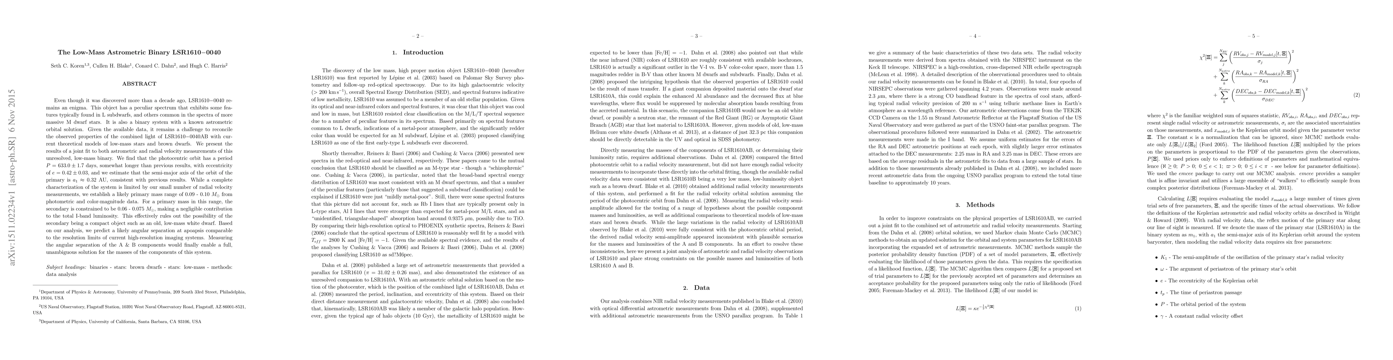Even though it was discovered more than a decade ago, LSR1610-0040 remains an enigma. This object has a peculiar spectrum that exhibits some features typically found in L subdwarfs, and others common in the spectra of more massive M dwarf stars. It is also a binary system with a known astrometric orbital solution. Given the available data, it remains a challenge to reconcile the observed properties of the combined light of LSR1610-0040AB with current theoretical models of low-mass stars and brown dwarfs. We present the results of a joint fit to both astrometric and radial velocity measurements of this unresolved, low-mass binary. We find that the photocentric orbit has a period $P = 633.0 \pm 1.7$ days, somewhat longer than previous results, with eccentricity of $e = 0.42 \pm 0.03$, and we estimate that the semi-major axis of the orbit of the primary is $a_1 \approx 0.32$ AU, consistent with previous results. While a complete characterization of the system is limited by our small number of radial velocity measurements, we establish a likely primary mass range of $0.09 - 0.10 M_\odot$ from photometric and color-magnitude data. For a primary mass in this range, the secondary is constrained to be $0.06 - 0.075 M_\odot$, making a negligible contribution to the total I-band luminosity. This effectively rules out the possibility of the secondary being a compact object such as an old, low-mass white dwarf. Based on our analysis, we predict a likely angular separation at apoapsis comparable to the resolution limits of current high-resolution imaging systems. Measuring the angular separation of the A & B components would finally enable a full, unambiguous solution for the masses of the components of this system.