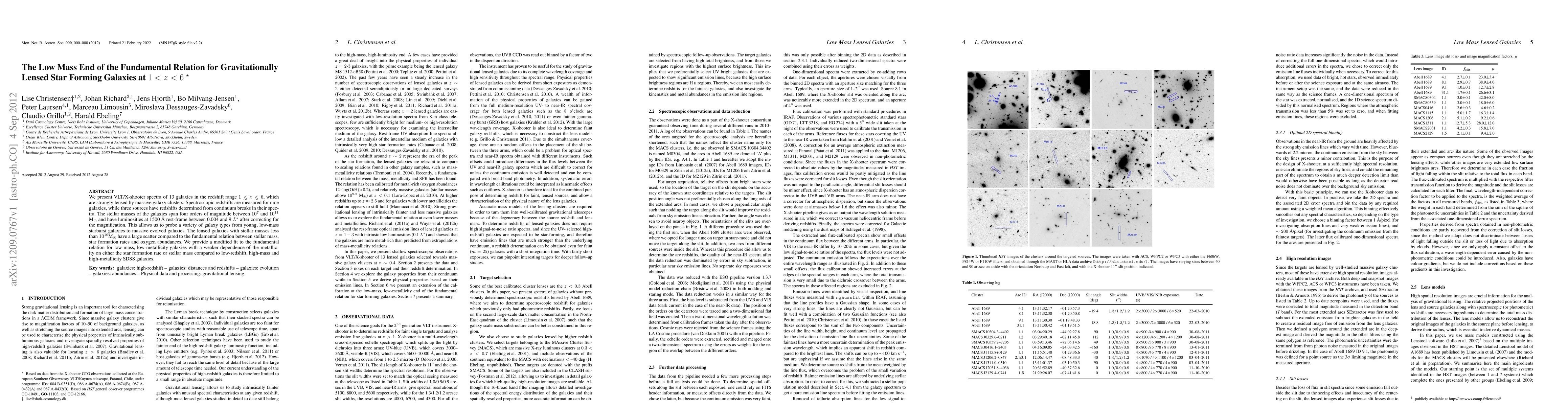 We present VLT/X-shooter spectra of 13 galaxies in the redshift range 1< z < 6, which are strongly lensed by massive galaxy clusters. Spectroscopic redshifts are measured for nine galaxies, while three sources have redshifts determined from continuum breaks in their spectra. The stellar masses of the galaxies span four orders of magnitude between 10^7 and 10^11 M_sun and have luminosities at 1500 A rest-frame between 0.004 and 9 L^* after correcting for the magnification. This allows us to probe a variety of galaxy types from young, low-mass starburst galaxies to massive evolved galaxies. The lensed galaxies with stellar masses less than 10^10 M_sun have a large scatter compared to the fundamental relation between stellar mass, star formation rates and oxygen abundances. We provide a modified fit to the fundamental relation for low-mass, low-metallicity galaxies with a weaker dependence of the metallicity on either the star formation rate or stellar mass compared to low-redshift, high-mass and high-metallicity SDSS galaxies.