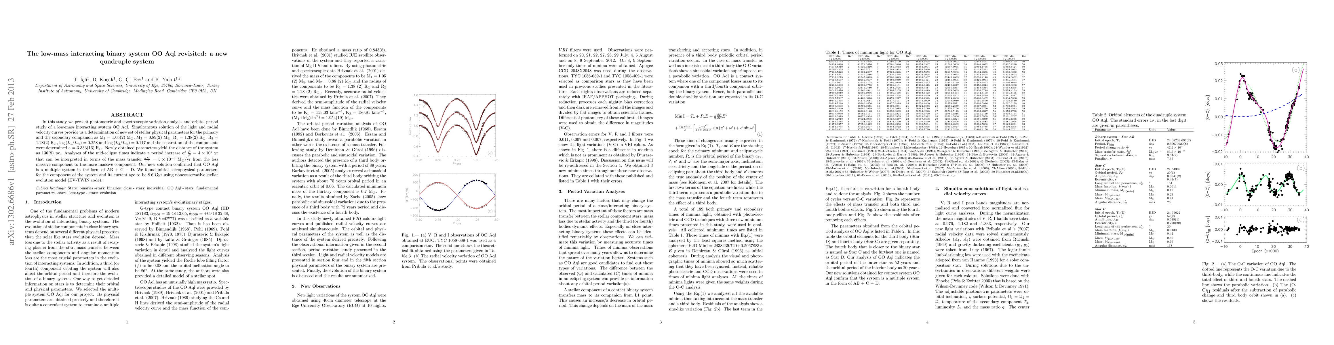 In this study we present photometric and spectroscopic variation analysis and orbital period study of a low-mass interacting system OO Aql. Simultaneous solution of the light and radial velocity curves provide us a determination of new set of stellar physical parameters for the primary and the secondary companion as M$_{1}$ = 1.05(2) M$_{\odot}$, M$_{2}$ = 0.89(2) M$_{\odot}$, R$_{1}$ = 1.38(2) R$_{\odot}$, R$_{2}$ = 1.28(2) R$_{\odot}$, $\log{(L_1/L_{\odot})} = 0.258$ and $\log{(L_2/L_{\odot})} = 0.117$ and the separation of the components were determined a = 3.333(16) R$_{\odot}$. Newly obtained parameters yield the distance of the system as 136(8) pc. Analyses of the mid-eclipse times indicate a period increase of $\frac{P}{\dot{P}}=4\times 10^{7}$ yr that can be interpreted in terms of the mass transfer $\frac{dM}{dt}=5\times 10^{-8}$ M$_{\odot}$/yr from the less massive component to the more massive component. Our new solution confirmed that OO Aql is a multiple system in the form of AB + C + D. We found initial astrophysical parameters for the component of the system and its current age to be 8.6 Gyr using nonconservative stellar evolution model (EV-TWIN code).
