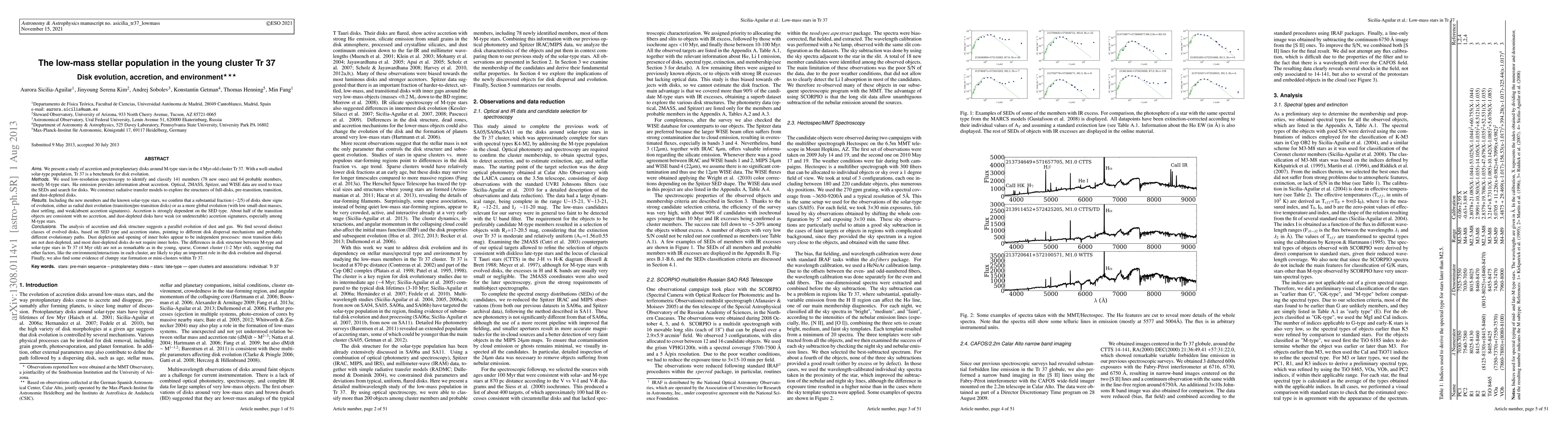 We present a study of accretion and protoplanetary disks around M-type stars in the 4 Myr-old cluster Tr37. With a well-studied solar-type population, Tr37 is a benchmark for disk evolution. We used low-resolution spectroscopy to identify 141 members (78 new) and 64 probable members, mostly M-type stars. H\alpha\ emission provides information about accretion. Optical, 2MASS, Spitzer, and WISE data are used to trace the SEDs. We construct radiative transfer models to explore the structures of full-disks, pre-transition, transition, and dust-depleted disks. Including the new and previously known members, we confirm that a substantial fraction (~2/5) of disks show signs of evolution, either as radial dust evolution (transition/pre-transition disks) or as a more global evolution (low small-dust masses, dust settling, and weak/absent accretion signatures). Accretion is strongly dependent on the SED type. About half of the transition objects are consistent with no accretion, and dust-depleted disks have weak (or undetectable) accretion signatures, especially among M-type stars. The analysis of accretion and disk structure suggests a parallel evolution of dust and gas. We find several distinct classes of evolved disks, based on SED type and accretion, pointing to different disk dispersal mechanisms and probably different evolutionary paths. Dust depletion and opening of inner holes appear to be independent processes: most transition disks are not dust-depleted, and most dust-depleted disks do not require inner holes. The differences in disk structure between M-type and solar-type stars in Tr37 (4 Myr) are not as remarkable as in the young, sparse, Coronet cluster (1-2 Myr), suggesting that other factors, like the environment/interactions, are likely to play a role in the disk evolution and dispersal. Finally, we also find some evidence of clumpy star formation or mini-clusters within Tr37.