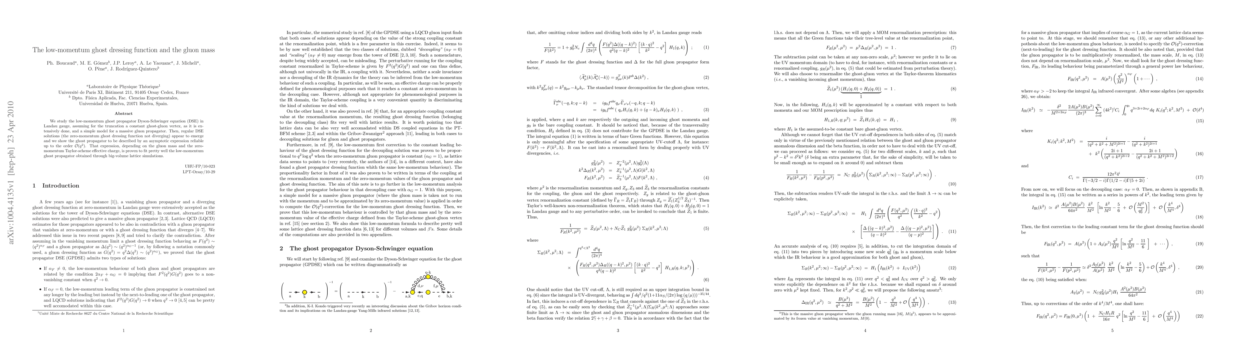 The paper presents an asymptotic expression for the low-momentum ghost propagator, reliable up to O(q^2), and demonstrates its compatibility with lattice simulation data. It also establishes a connection between the ghost dressing function and the gluon mass, as well as the zero-momentum effective charge.