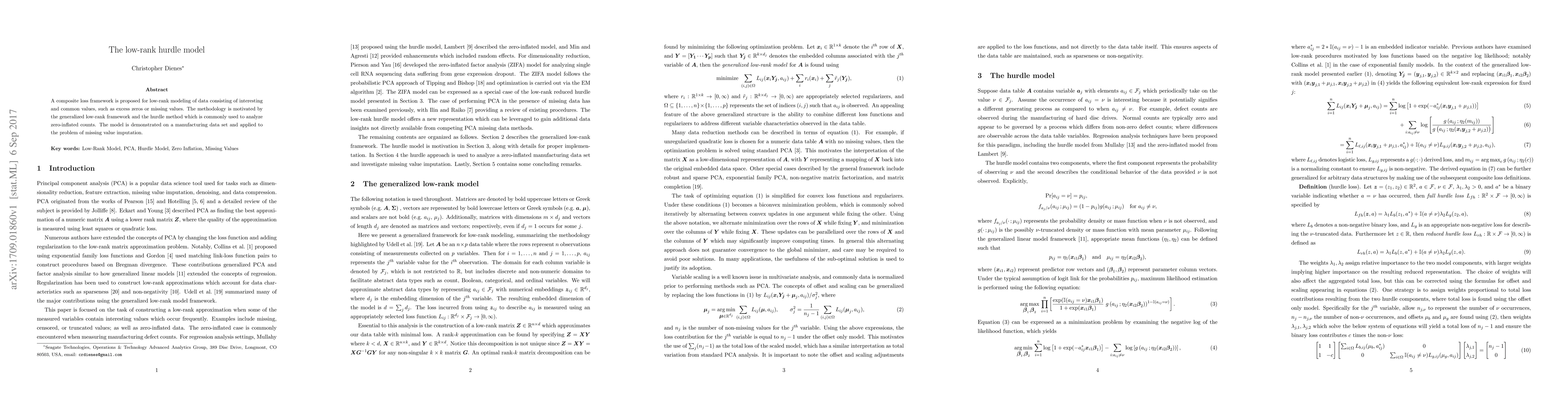 A composite loss framework is proposed for low-rank modeling of data consisting of interesting and common values, such as excess zeros or missing values. The methodology is motivated by the generalized low-rank framework and the hurdle method which is commonly used to analyze zero-inflated counts. The model is demonstrated on a manufacturing data set and applied to the problem of missing value imputation.