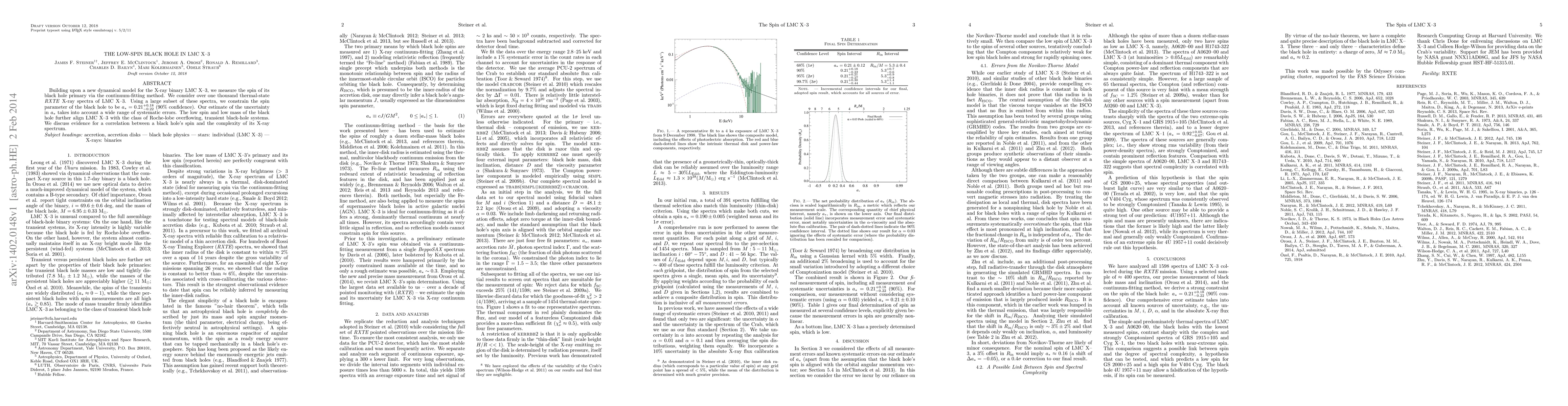 This study employs a new dynamical model and continuum-fitting method to determine the spin of the black hole in LMC X-3, finding a spin parameter of 0.21 with 90% confidence, and discusses potential correlations between the black hole's spin and the complexity of its X-ray spectrum.