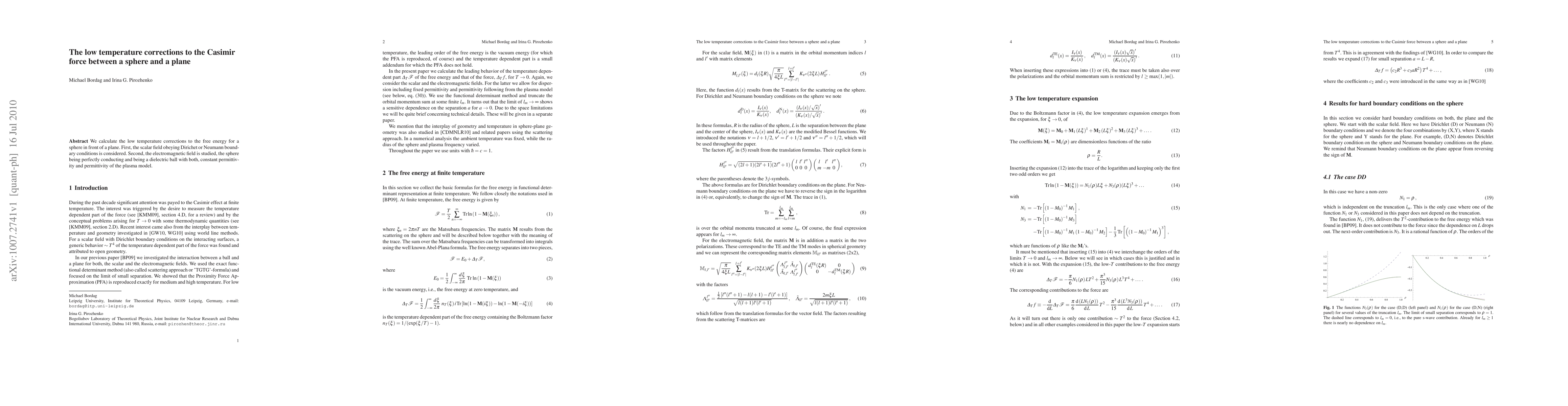 We calculate the low temperature corrections to the free energy for a sphere in front of a plane. First, the scalar field obeying Dirichet or Neumann boundary conditions is considered. Second, the electromagnetic field is studied, the sphere being perfectly conducting and being a dielectric ball with both, constant permittivity and permittivity of the plasma model.