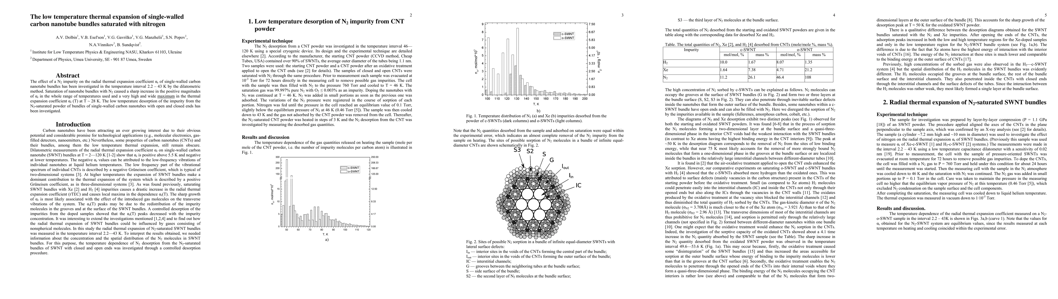 This study investigates the radial thermal expansion of nitrogen-saturated single-walled carbon nanotube bundles, revealing a significant increase in expansion coefficient due to N2 impurity, with a notable peak at around 28 K. The desorption behavior of N2 at low temperatures is also explored.
