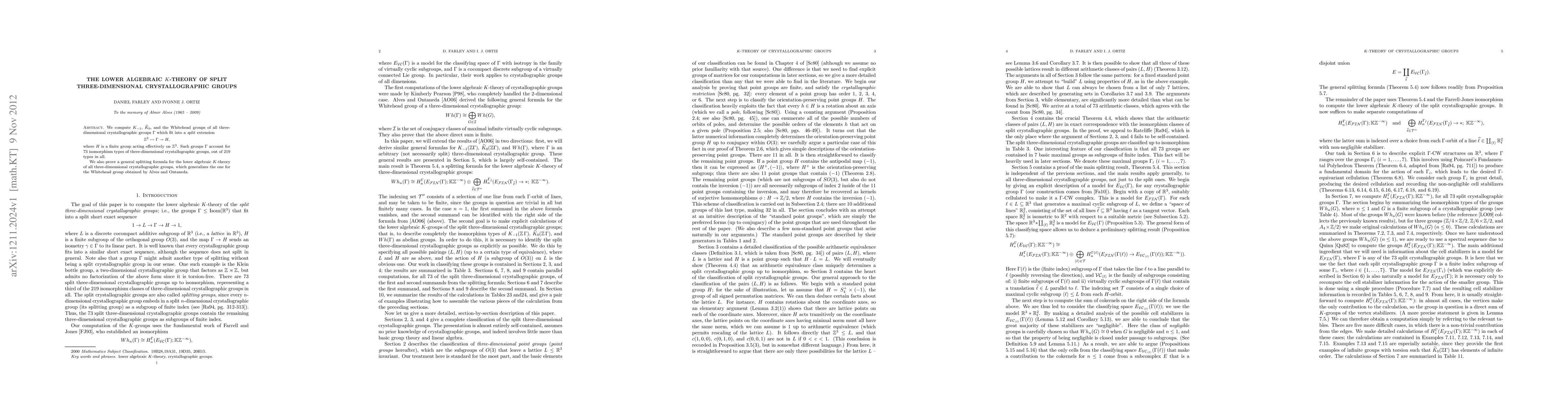 The paper presents a detailed computation and classification of split three-dimensional crystallographic groups, along with a general formula for their lower algebraic K-theory.