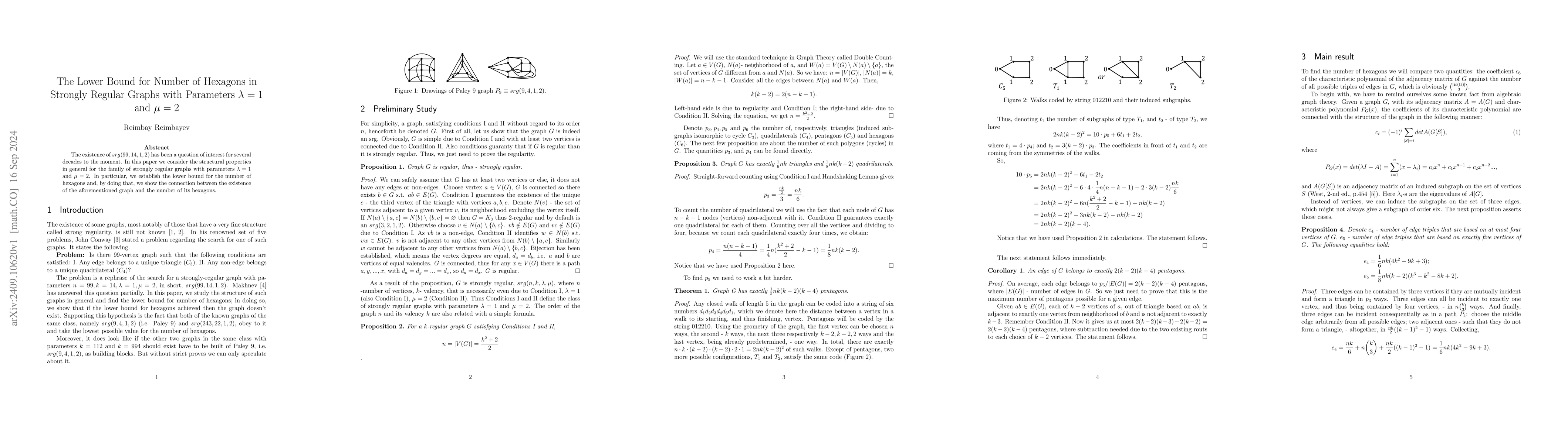 This paper investigates the structural properties of strongly regular graphs (SRGs) with parameters $\lambda = 1$ and $\mu = 2$, establishing a lower bound for the number of hexagons within these graphs. The findings highlight a relationship between the existence of SRG(99,14,1,2) and the quantity of hexagons present in these graphs.