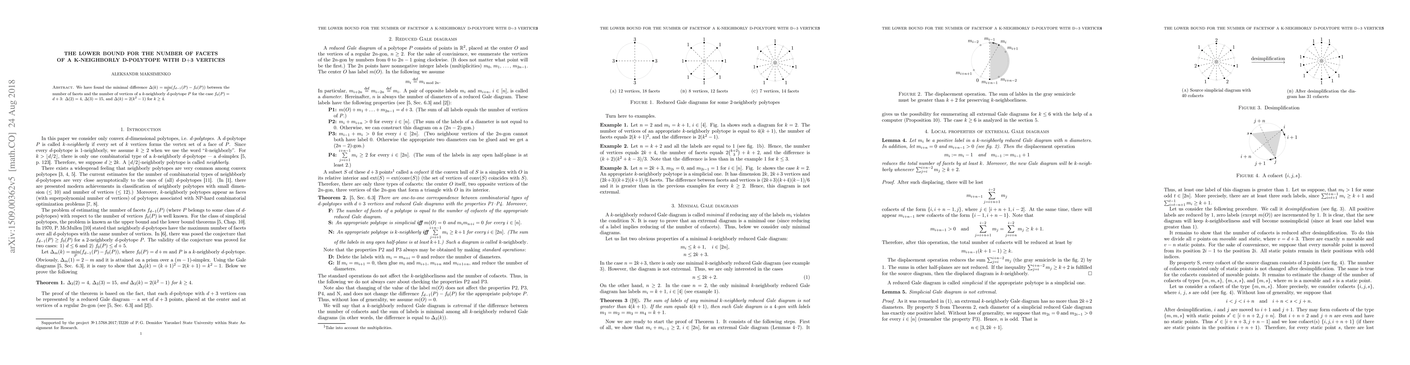 Summary: This paper determines the minimum difference between the number of facets and vertices for k-neighborly d-polytopes with d+3 vertices, finding $\Delta(2) = 4$, $\Delta(3) = 15$, and $\Delta(k) = 2(k^2 - 1)$ for k ≥ 4.