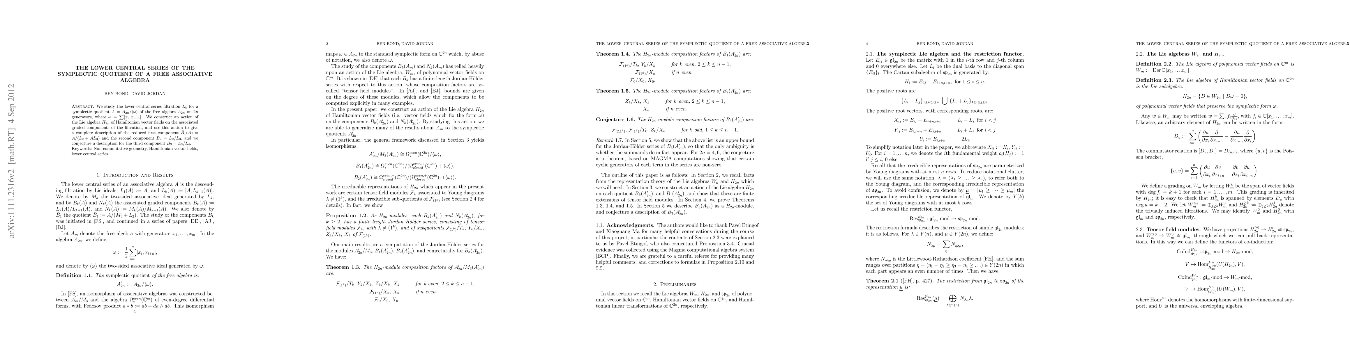 This paper investigates the lower central series filtration in the symplectic quotient of a free associative algebra, constructing an action of the Hamiltonian vector fields' Lie algebra on the graded components. It provides a complete description of the first two components and conjectures a description for the third component.