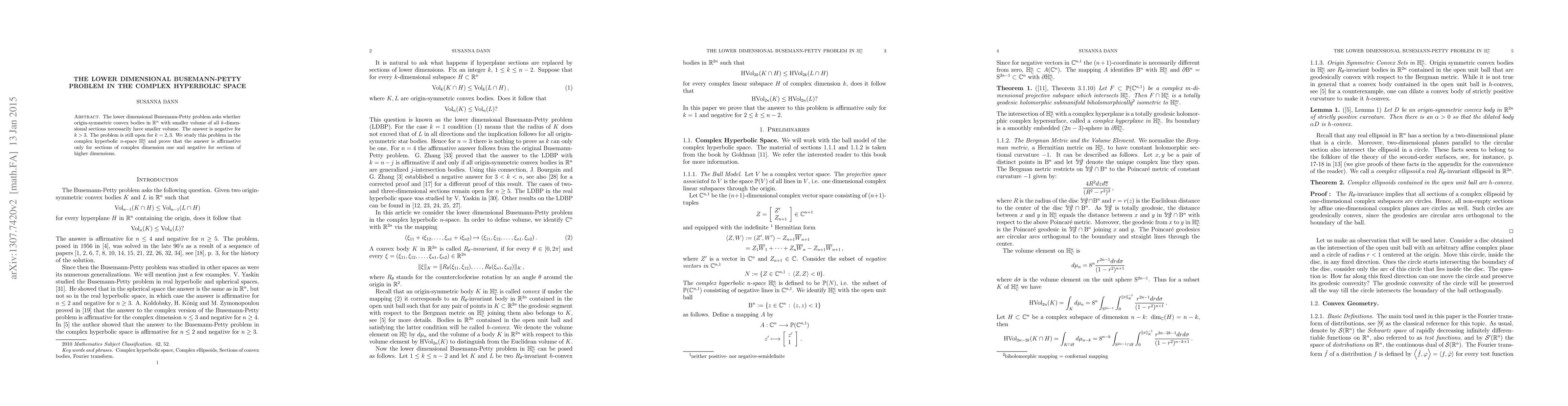The lower dimensional Busemann-Petty problem in complex hyperbolic space confirms that origin-symmetric convex bodies with smaller k-dimensional sections have smaller volume only for k=1, while it remains negative for higher dimensions. The problem remains unresolved for k=2,3.