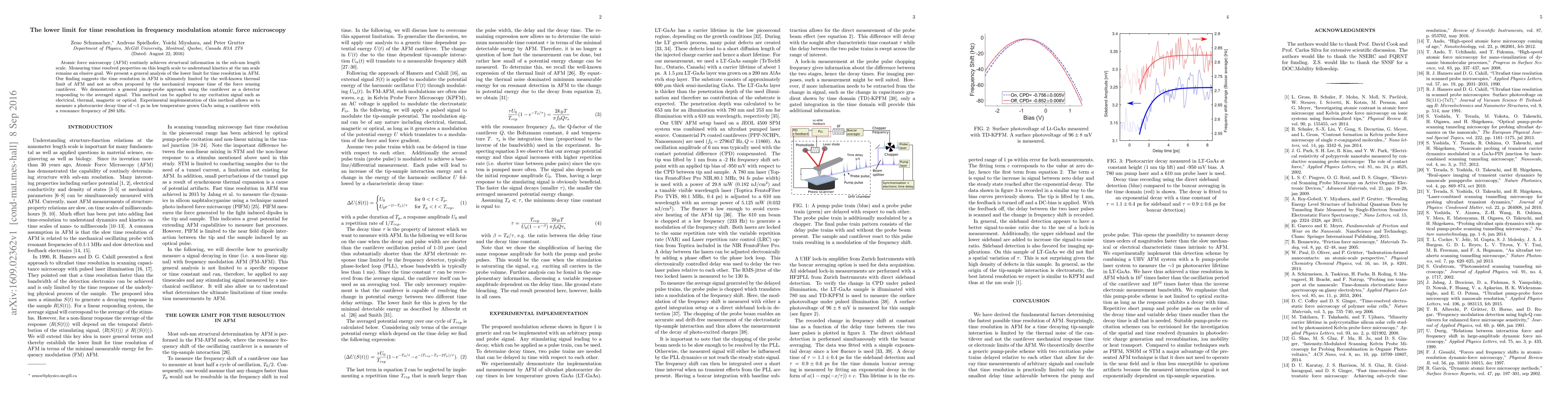 This paper analyzes the lower limit for time resolution in frequency modulation atomic force microscopy, concluding that it is fundamentally constrained by thermal limits rather than the mechanical response of the cantilever. The authors propose a pump-probe method to achieve sub-picosecond measurements, demonstrated by measuring a 1 ps photocarrier decay time in GaAs.