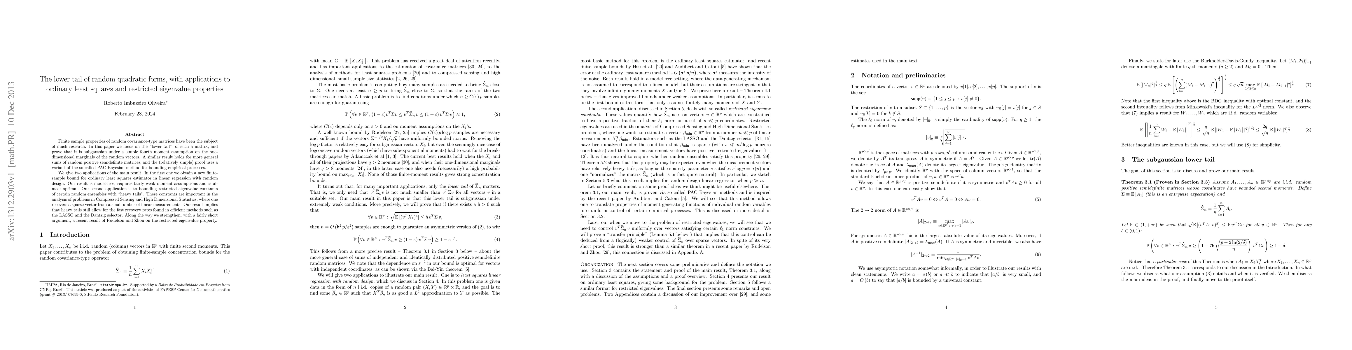 This paper investigates the lower tail behavior of random quadratic forms, proving subgaussianity under a fourth moment assumption. It applies this result to derive a new finite-sample bound for ordinary least squares estimators and to establish restricted eigenvalue constants in high-dimensional statistics, showing that heavy-tailed distributions still permit efficient recovery methods.