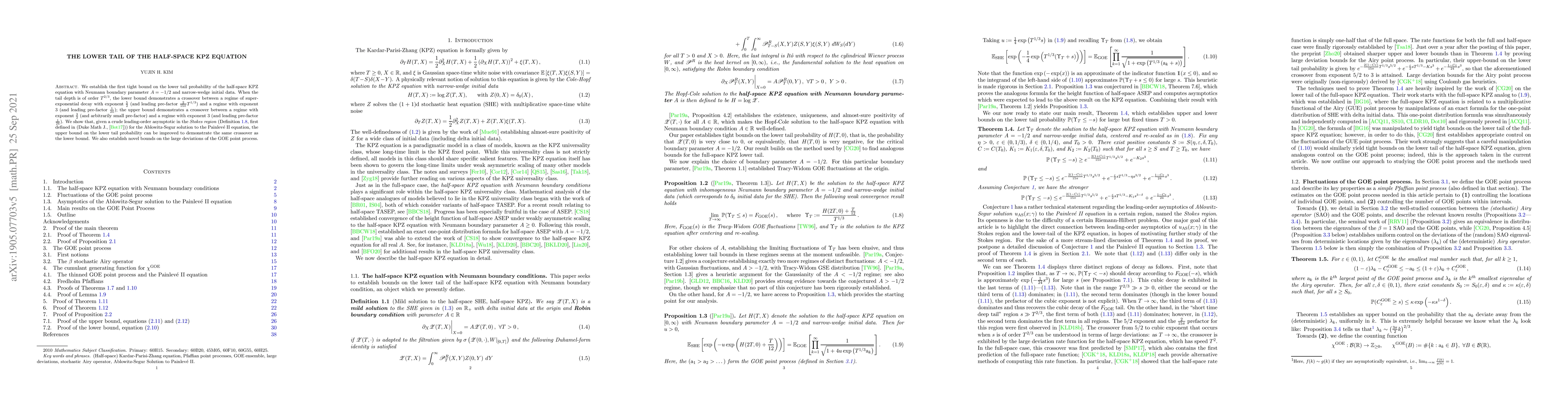 We establish the first tight bound on the lower tail probability of the half-space KPZ equation with Neumann boundary parameter $A = -1/2$ and narrow-wedge initial data. When the tail depth is of order $T^{2/3}$, the lower bound demonstrates a crossover between a regime of super-exponential decay with exponent $\frac{5}{2}$ (and leading pre-factor $\frac{2}{15 \pi}T^{1/3}$) and a regime with exponent $3$ (and leading pre-factor $\frac{1}{24}$); the upper bound demonstrates a crossover between a regime with exponent $\frac{3}{2}$ (and arbitrarily small pre-factor) and a regime with exponent $3$ (and leading pre-factor $\frac{1}{24}$). We show that, given a crude leading-order asymptotic in the Stokes region (Definition $1.7$, first defined in (Duke Math J., [Bot17])) for the Ablowitz-Segur solution to the Painlev\'e II equation, the upper bound on the lower tail probability can be improved to demonstrate the same crossover as the lower bound. We also establish novel bounds on the large deviations of the GOE point process.