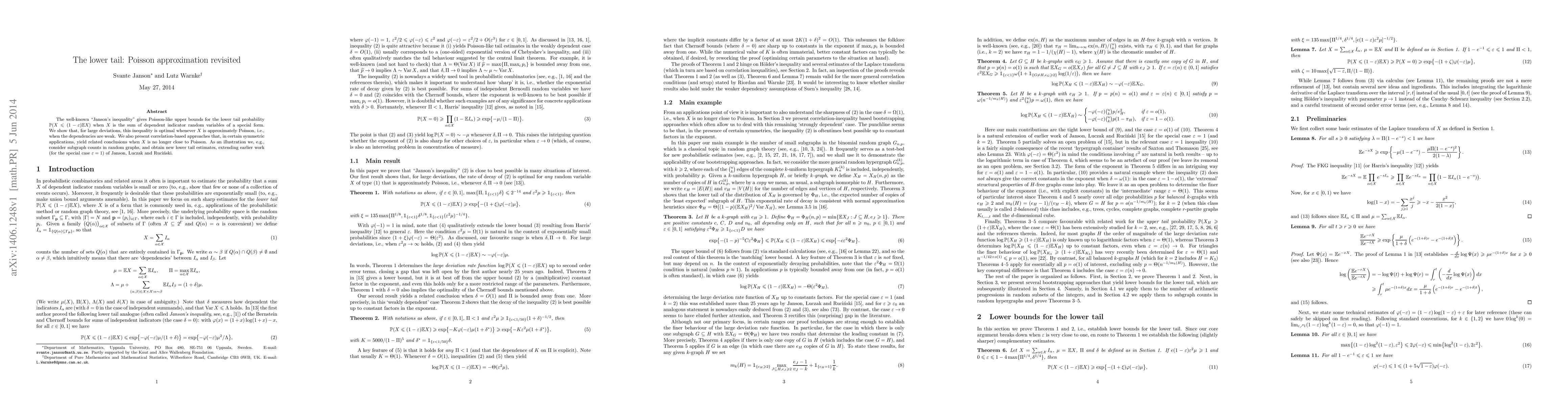 This paper revisits Janson's inequality for lower tail probabilities of sums of dependent indicator random variables, proving its optimality under weak dependencies when the sum is approximately Poisson. It also introduces correlation-based methods for cases where the sum deviates from a Poisson distribution, exemplified by new lower tail estimates for subgraph counts in random graphs.