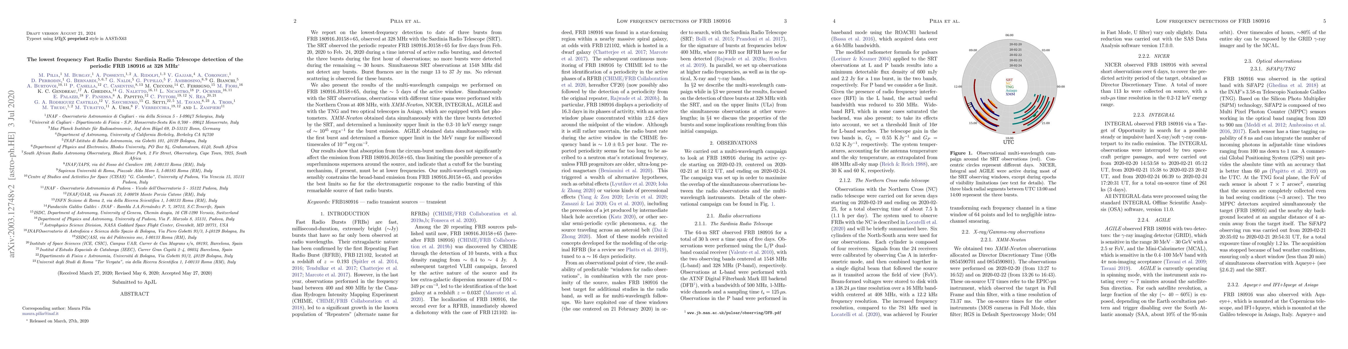 The Sardinia Radio Telescope detected three bursts from the periodic FRB 180916 at the lowest frequency of 328 MHz, with no further bursts observed over the next ~30 hours. The study also rules out significant absorption from the circumburst medium and constrains the electromagnetic emission from this fast radio burst source.