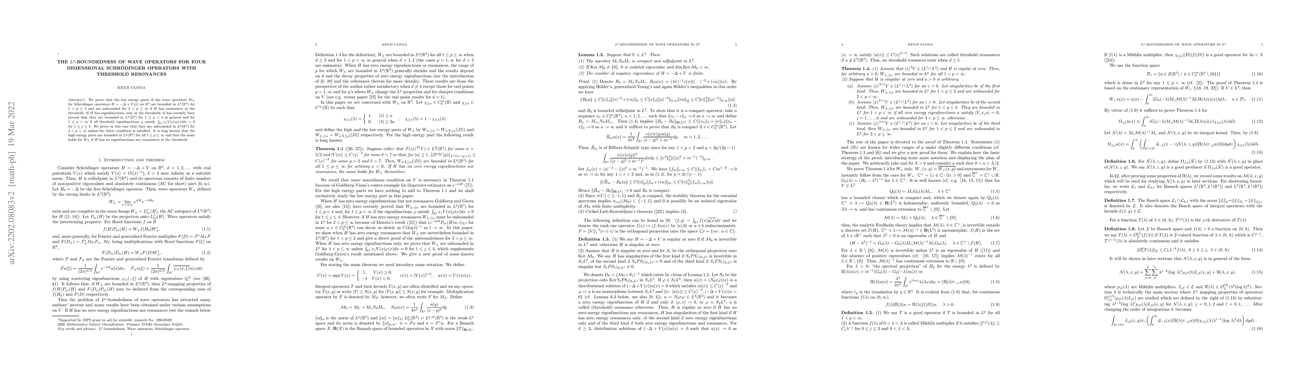 We prove that the low energy parts of the wave operators $W_\pm$ for Schr\"odinger operators $H = -\lap + V(x)$ on $\R^4$ are bounded in $ L^p(\R^4)$ for $1