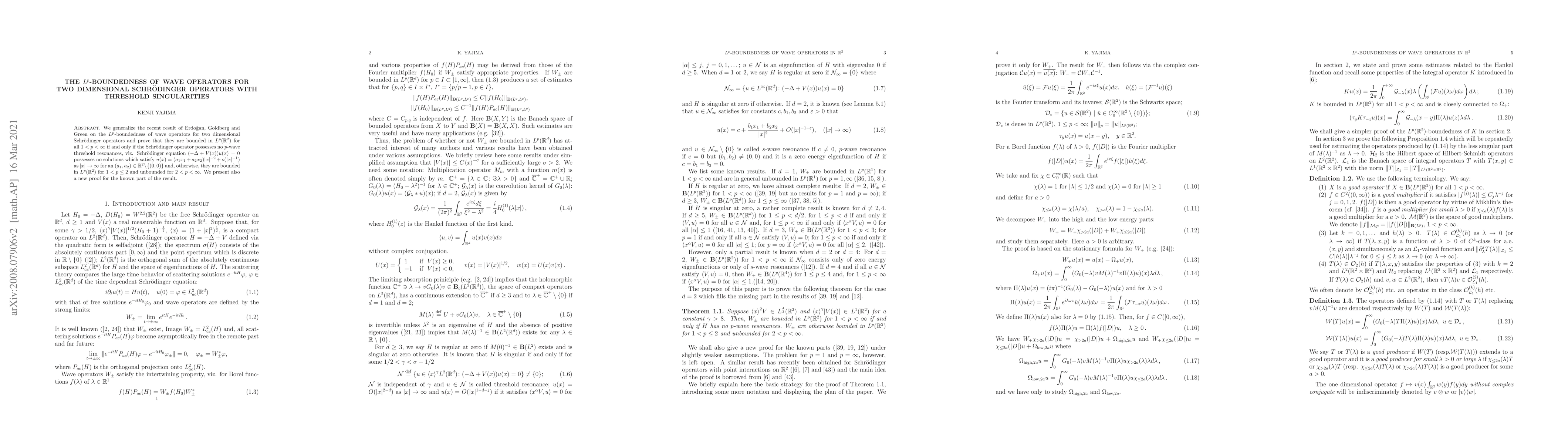 We generalize the recent result of Erdo{\u g}an, Goldberg and Green on the $L^p$-boundedness of wave operators for two dimensional Schr\"odinger operators and prove that they are bounded in $L^p(\R^2)$ for all $1